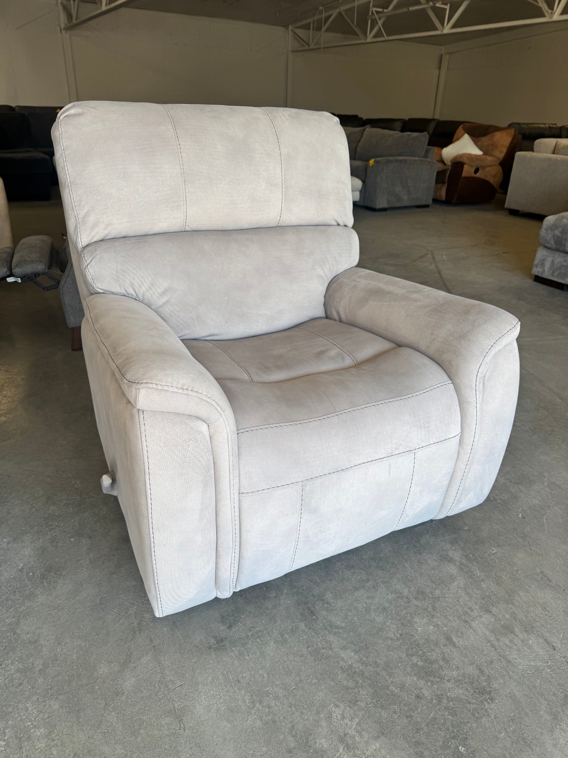 This comfortable beige microfiber rocking recliner is the perfect blend of cozy and practical. Upholstered in soft, neutral microfiber that works with almost any décor, it features smooth rocking motion and an easy manual recline—ideal for living rooms, nurseries, or a dedicated relaxation corner. A great everyday chair that’s comfortable without taking up too much space.