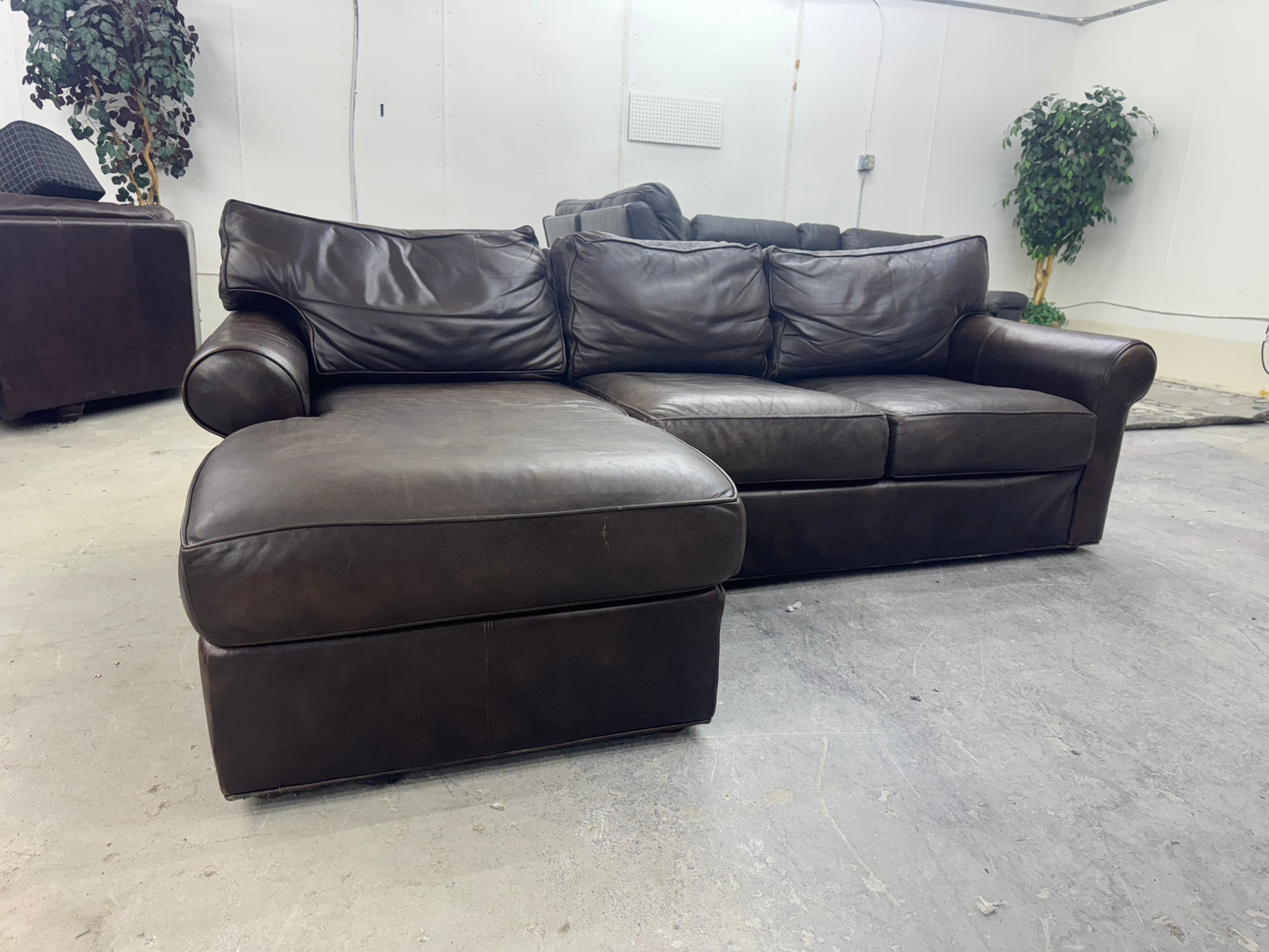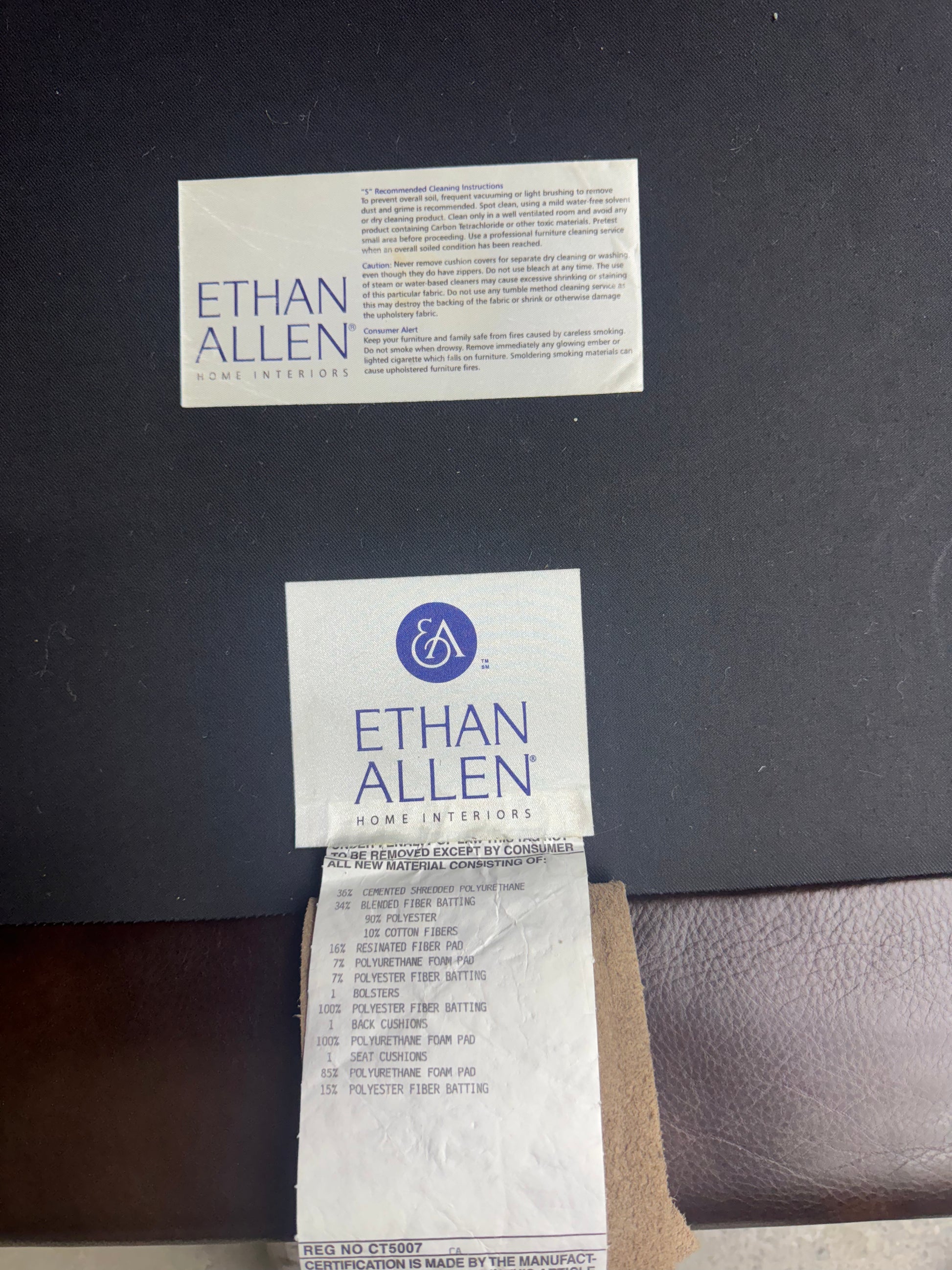This Ethan Allen L-shaped leather sectional offers timeless design, luxurious comfort, and top-quality craftsmanship. Upholstered in rich brown genuine leather, it features deep seating, supportive cushions, and that signature Ethan Allen durability that ensures it will last for years to come. Perfect for any living space seeking both elegance and comfort.