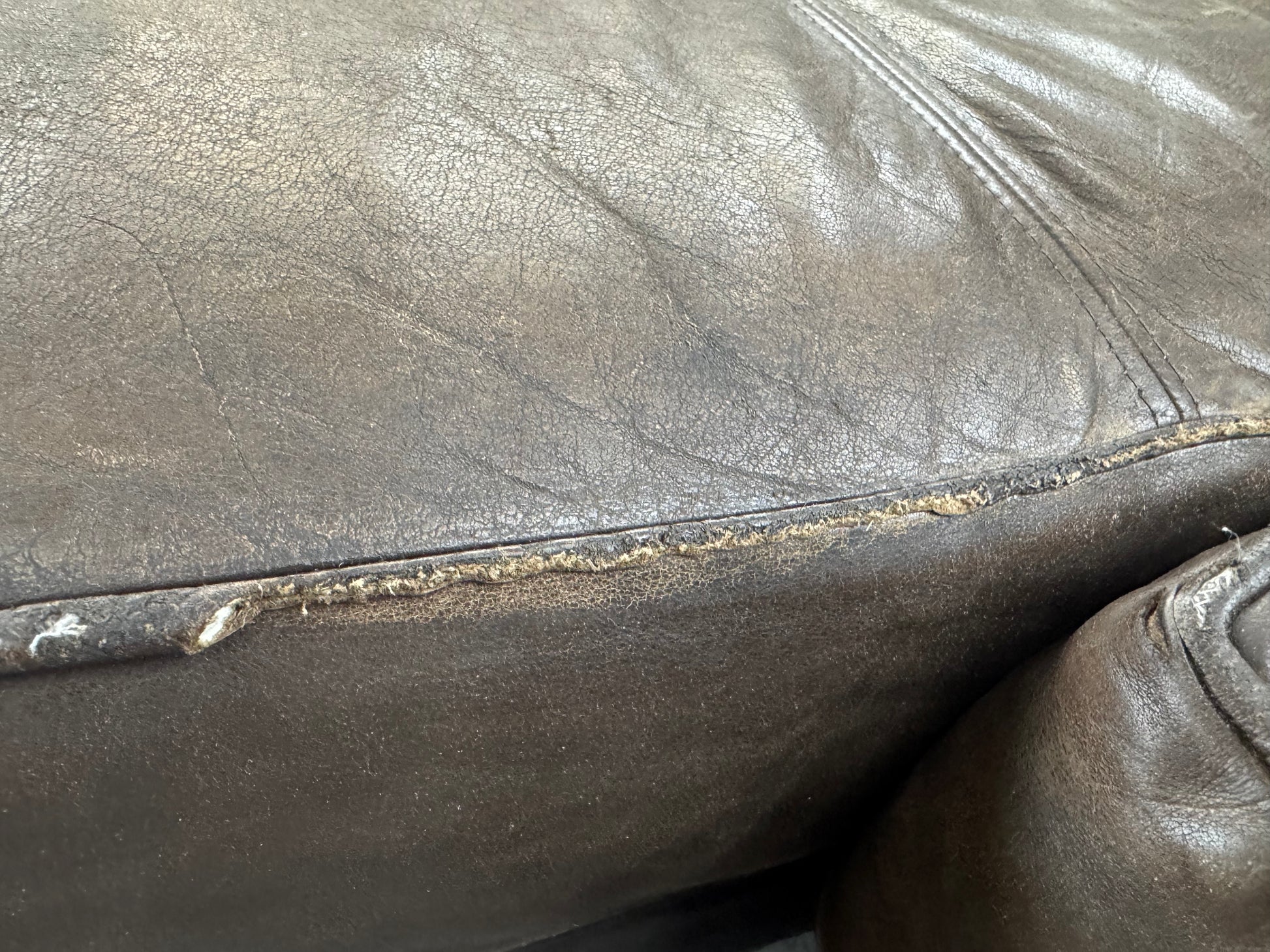 Some of the piping along the chaise is missing, which is why the price is so low (see photo). Other normal wear on the leather as expected with a used leather couch. The natural patina only adds to the timeless charm.