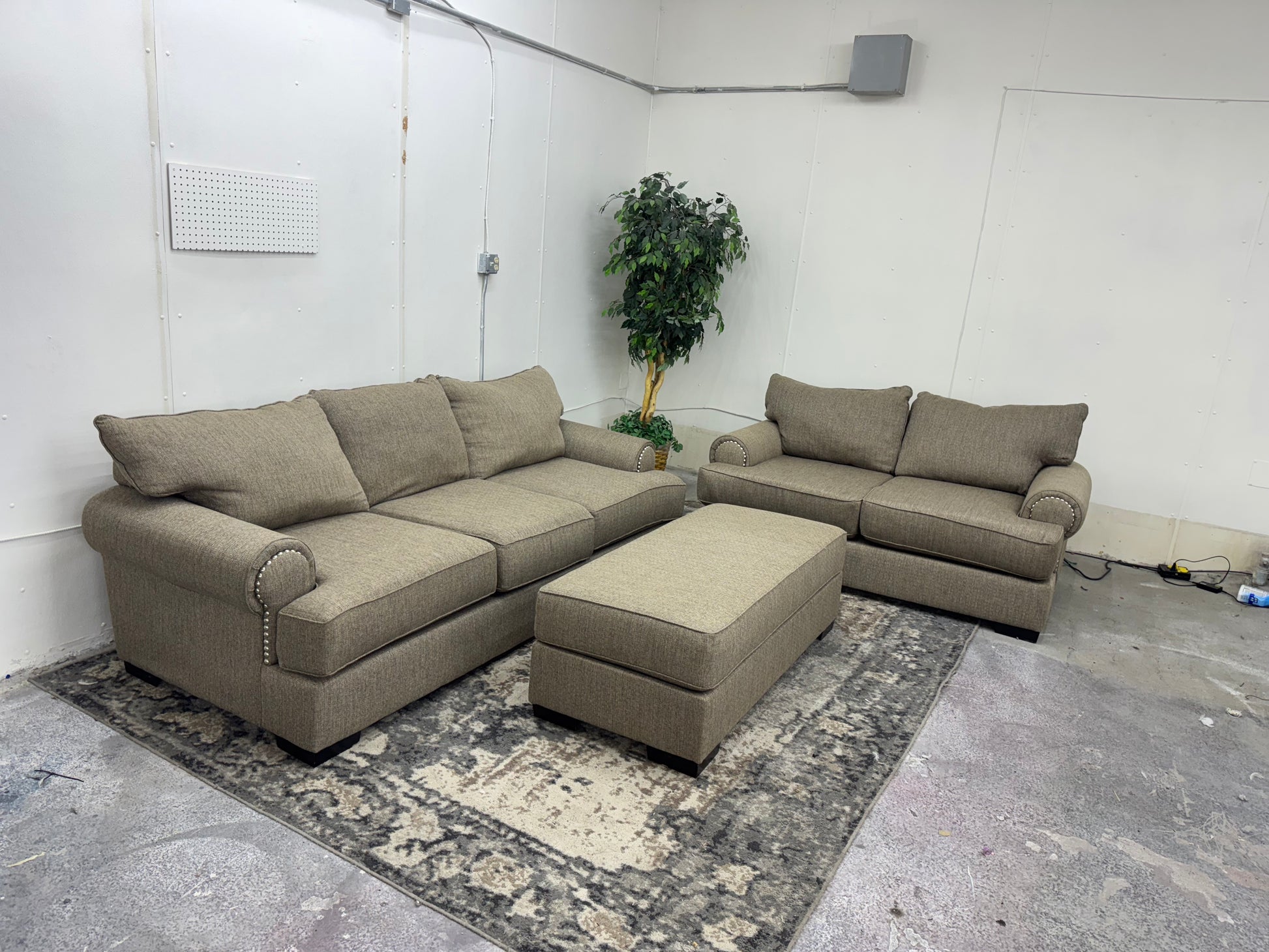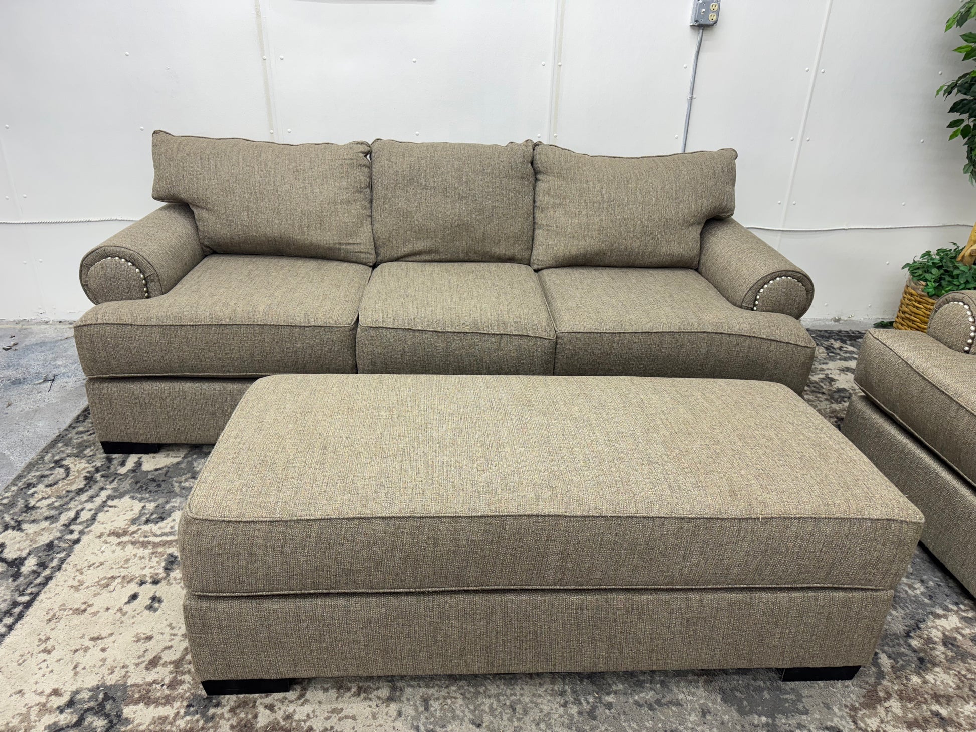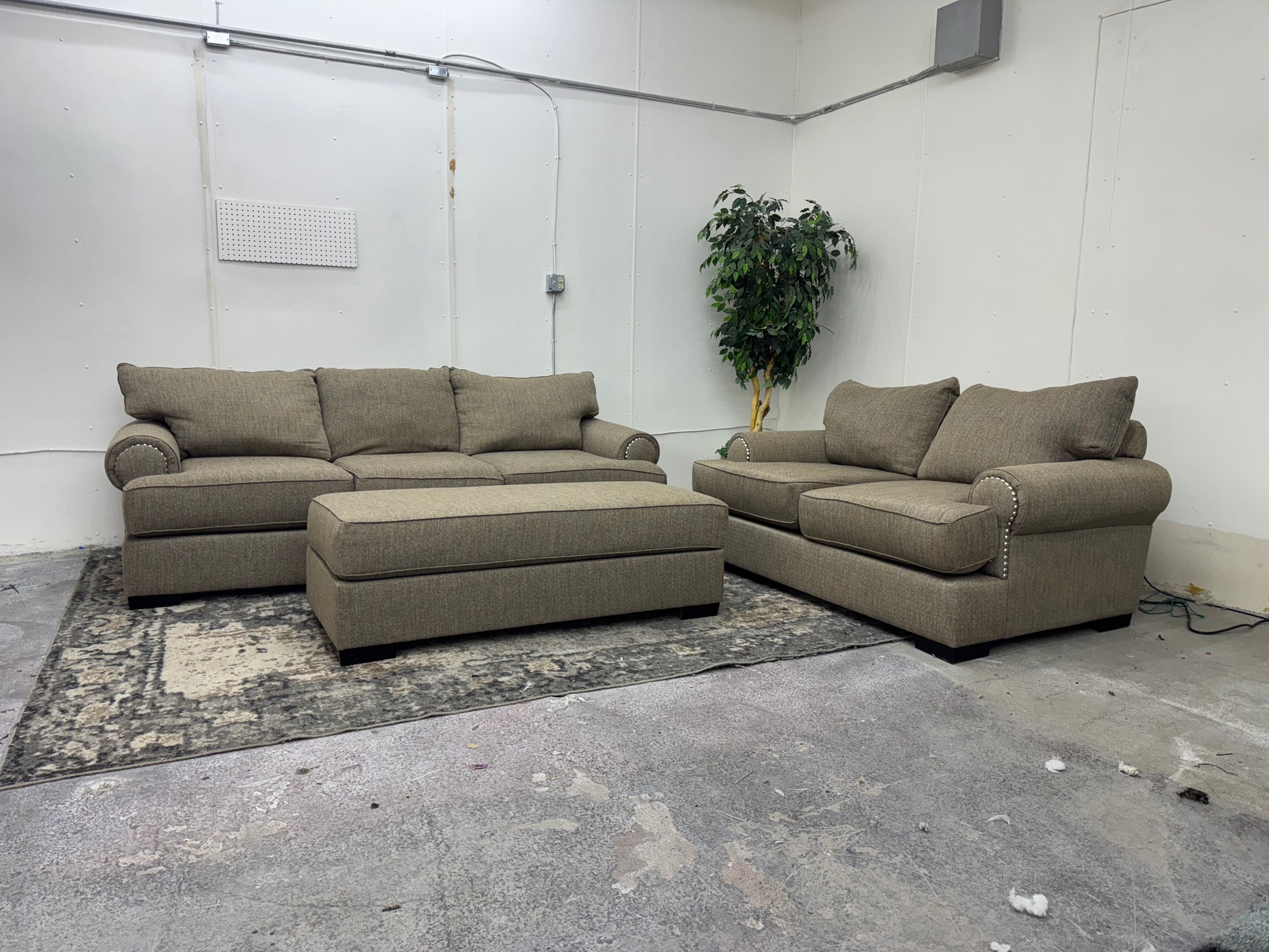 This brown couch and loveseat set features beautiful ornate wood trim, plush cushions, and a warm, classic design. Perfect for traditional-style homes, cabins, family living rooms, or anyone wanting a comfortable and elegant matching set.