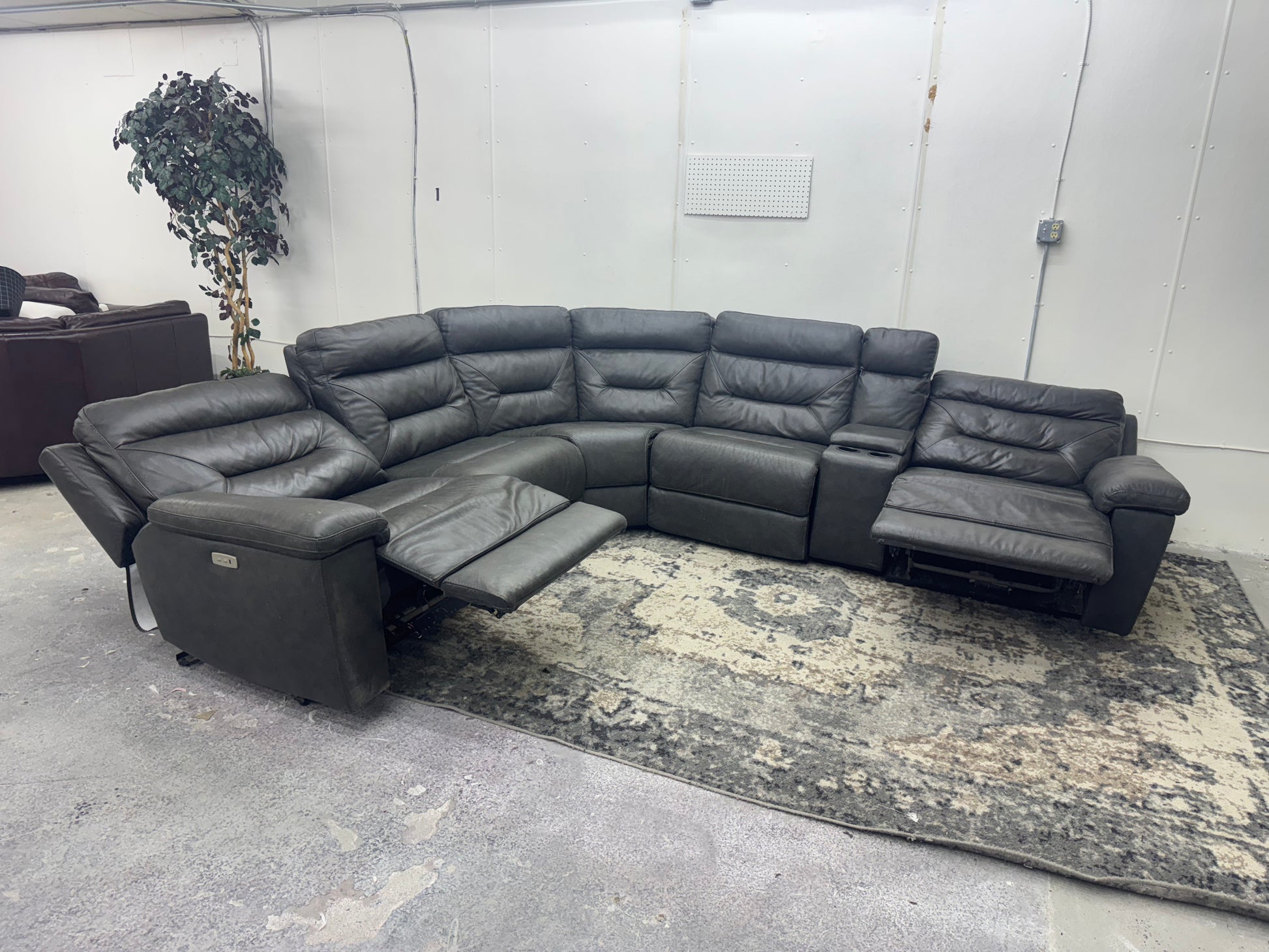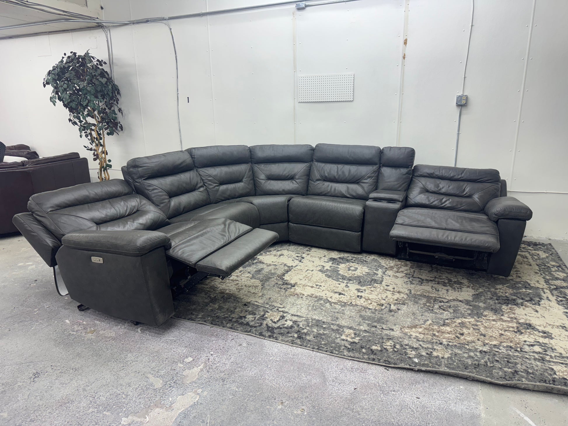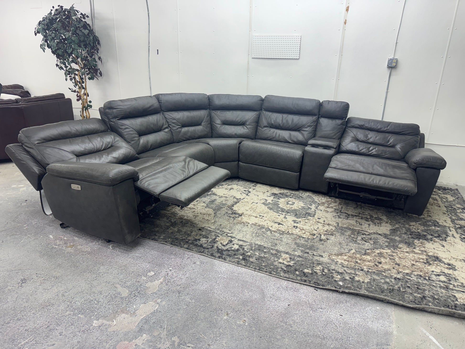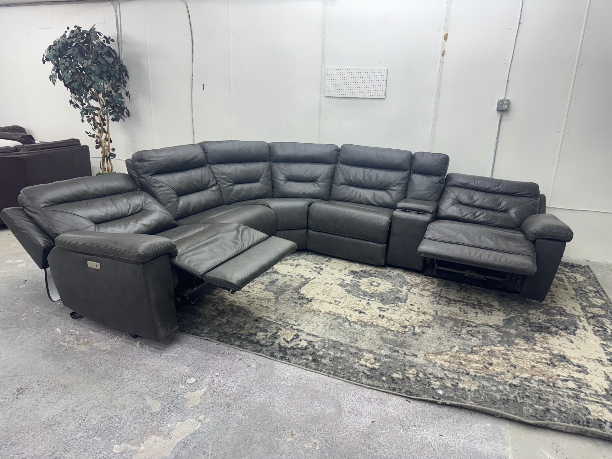 This charcoal gray 6-piece modular leather sectional delivers luxury and flexibility all in one. Featuring three smooth electric recliners, you can relax at the touch of a button while enjoying the premium leather finish and plush comfort. Its modular design allows you to change the configuration to perfectly fit your space.