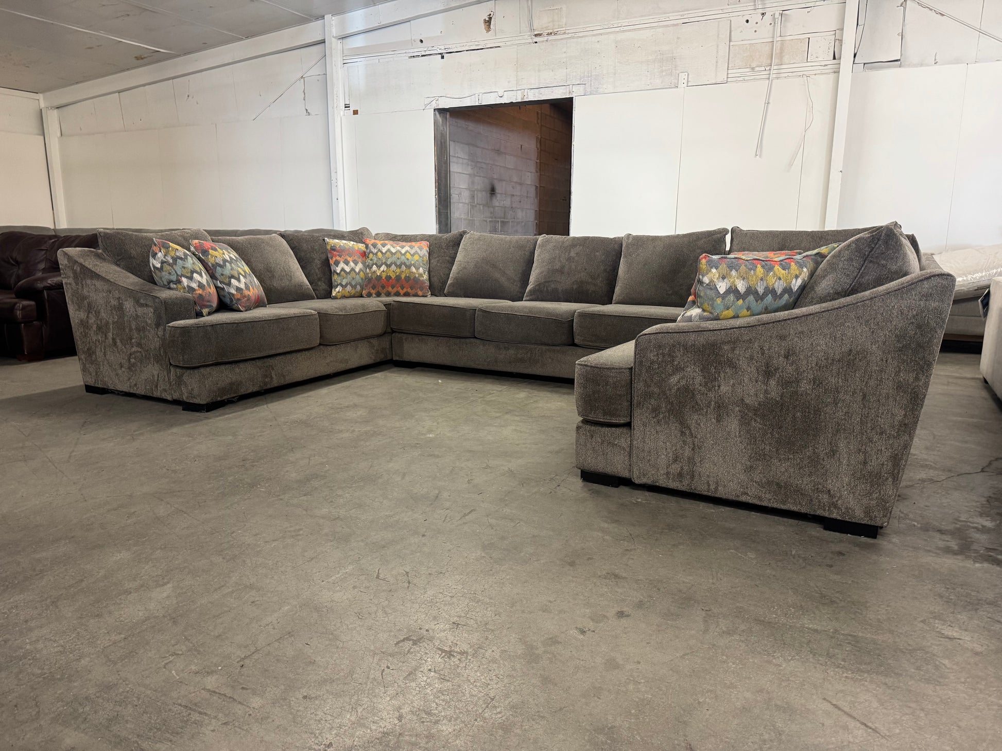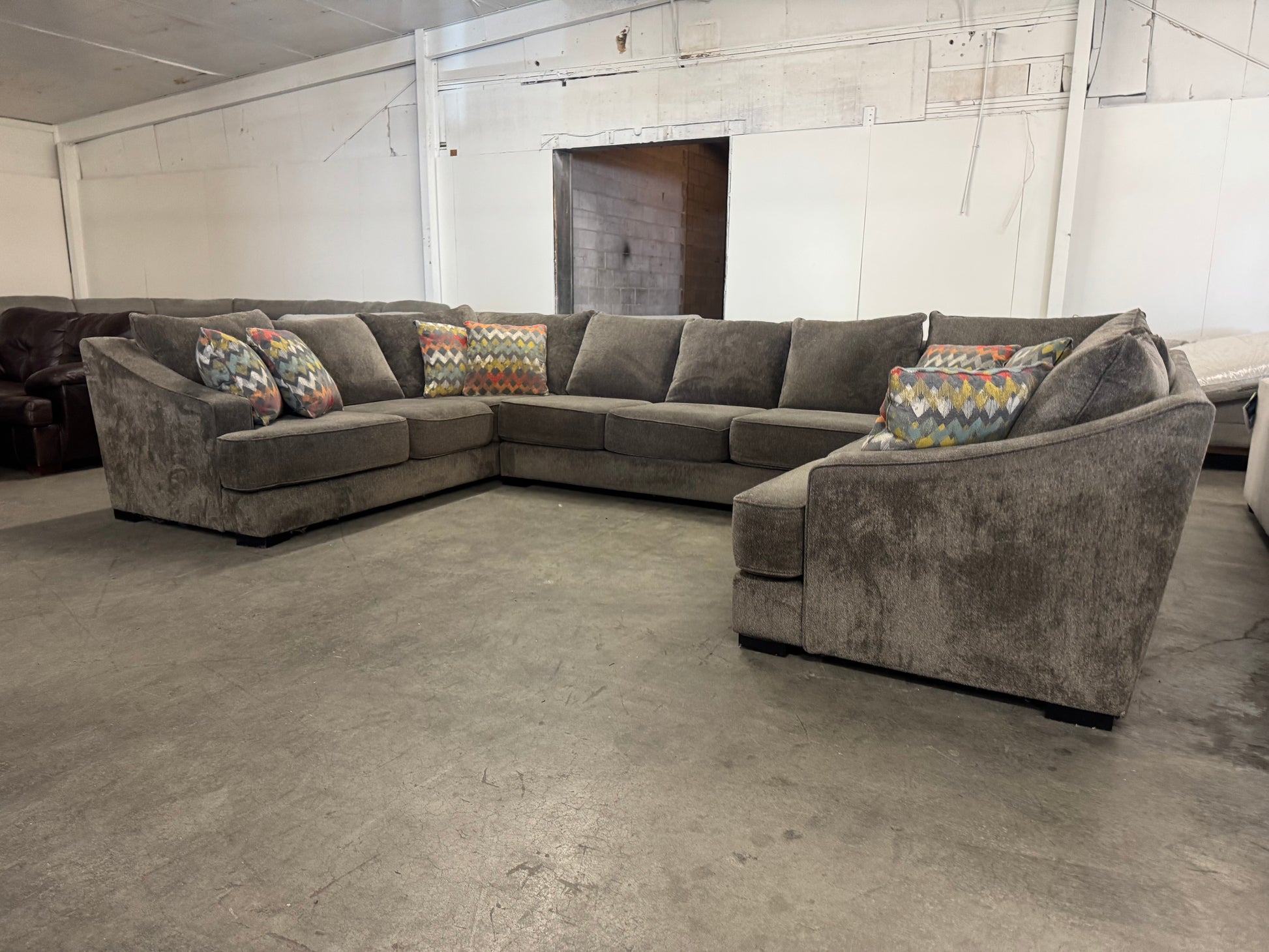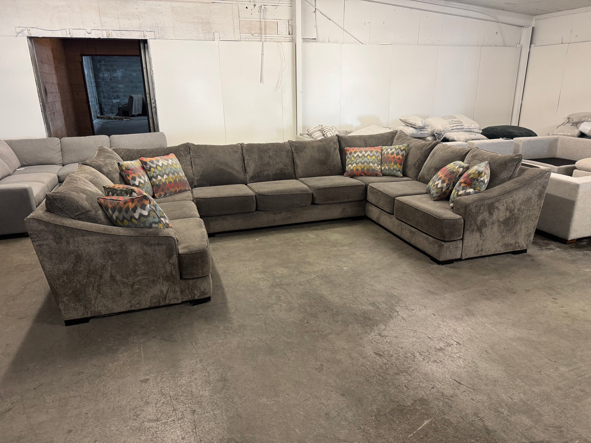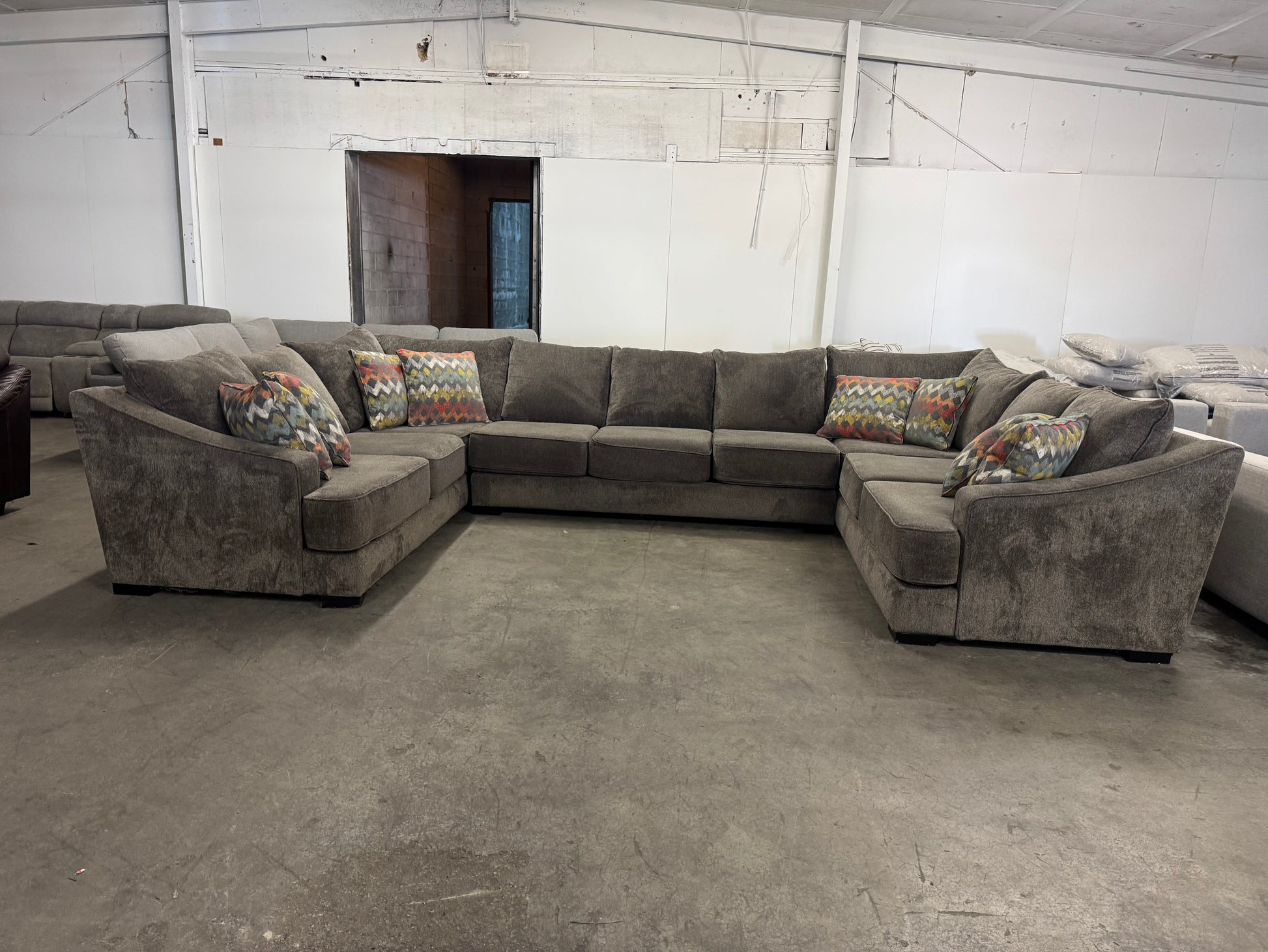 This gigantic U-shaped sectional sofa by Stanton Furniture is built to anchor a large living space. With deep, supportive seating and a roomy wraparound layout, it’s perfect for big families, hosting friends, or stretching out comfortably. The rich charcoal gray fabric is neutral, durable, and easy to style, while Stanton’s build quality delivers long-term comfort and structure.