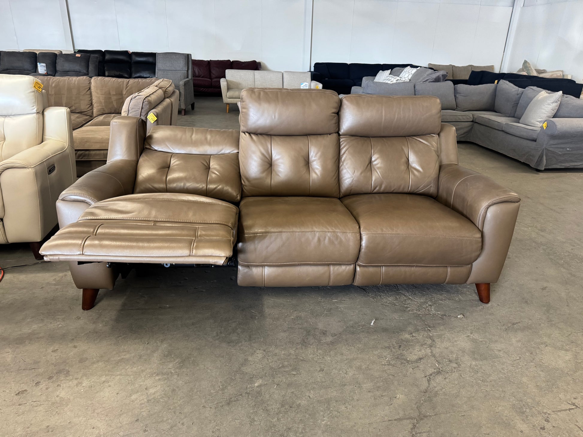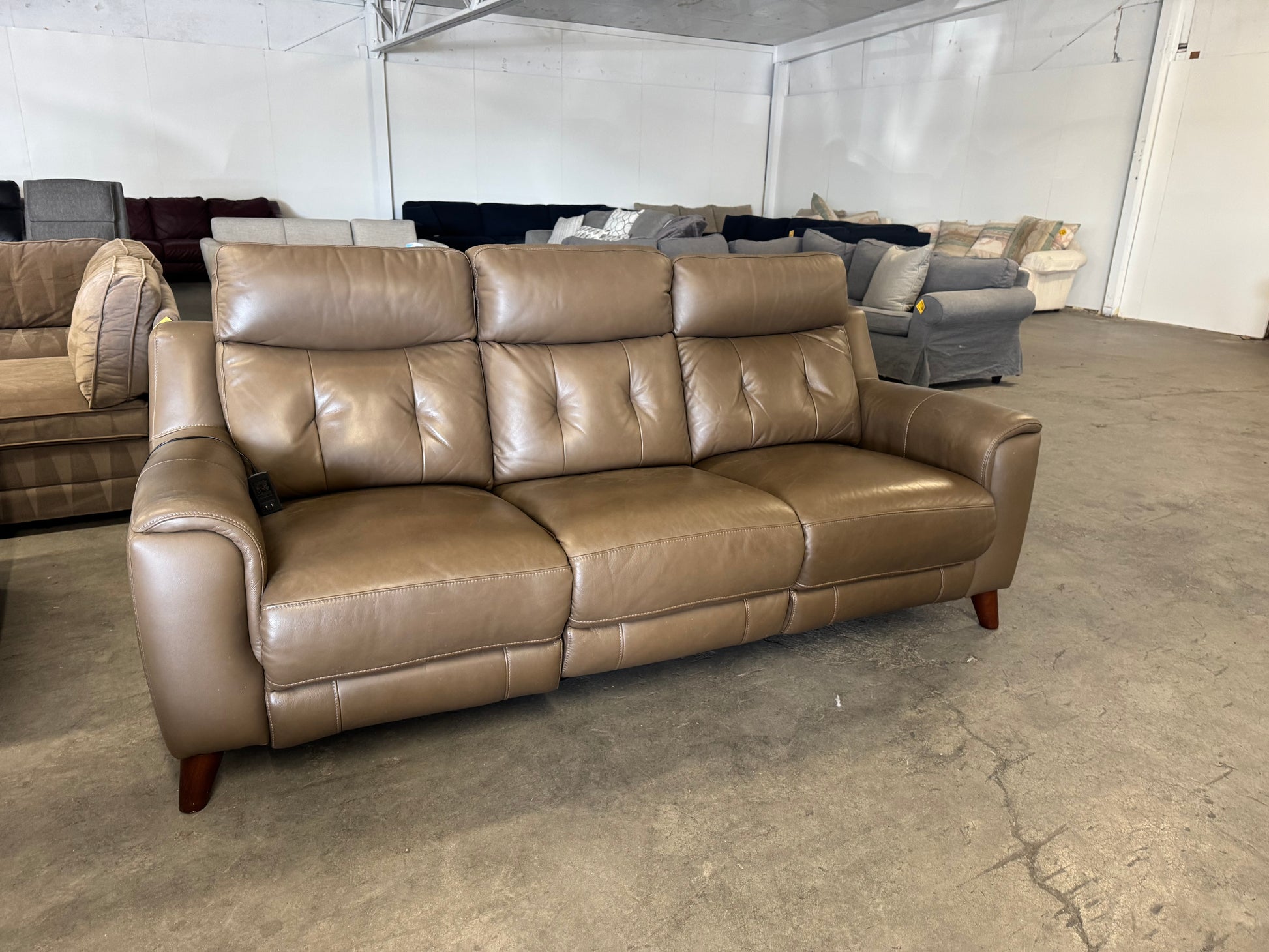 This is the Malibu Leather Power Reclining Sofa, originally sold at Costco and currently listed at $2,899.99 new. It features a clean, modern silhouette with tufted back cushions, power recline functionality, and premium leather seating surfaces.
