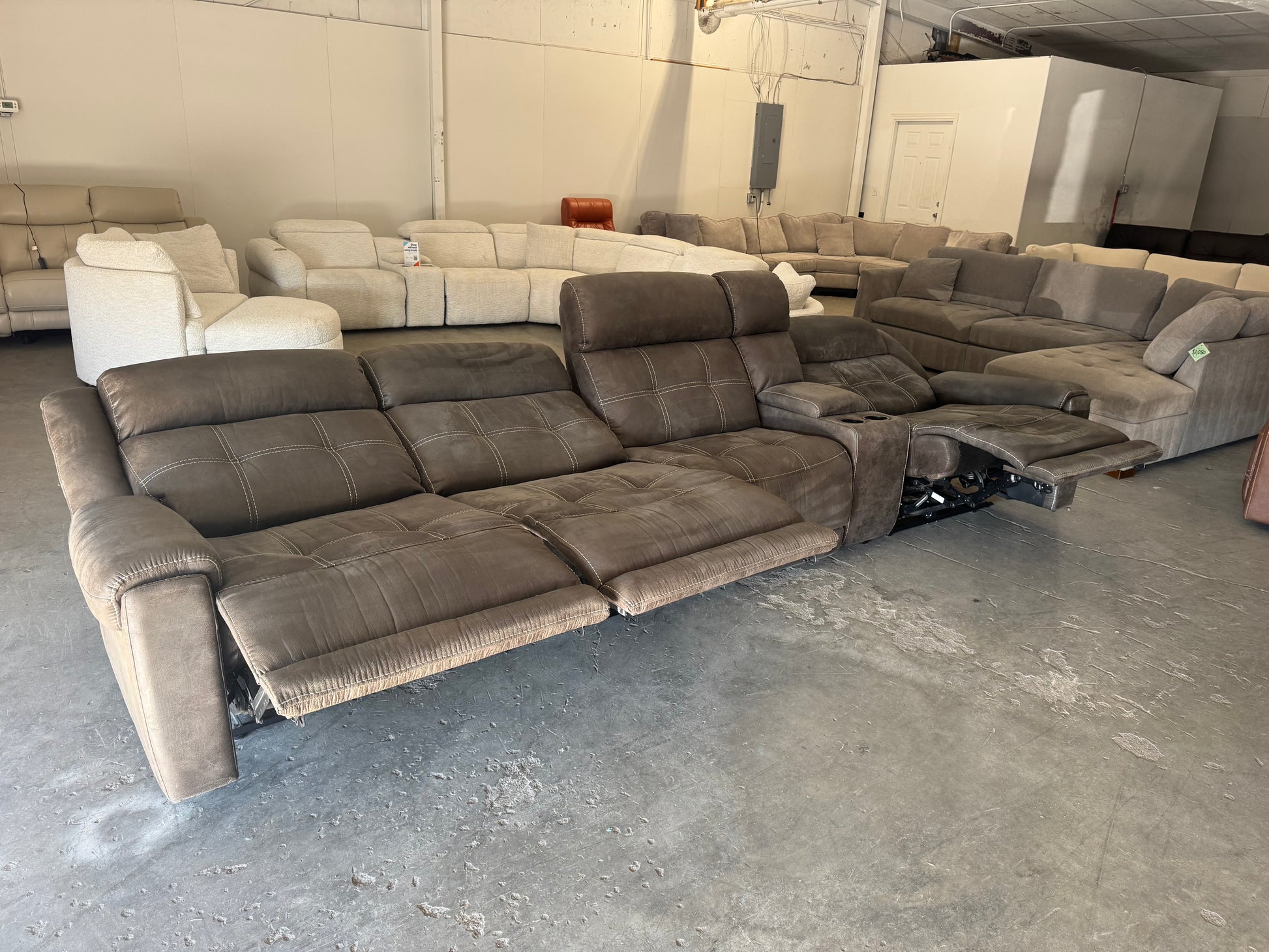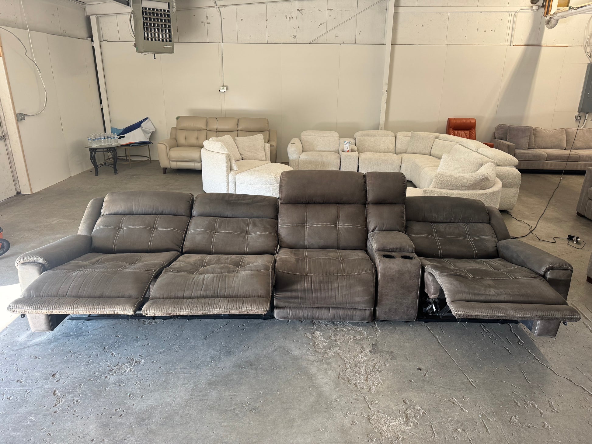 This gray 5-piece modular sectional is built for comfort and movie nights. Featuring three recliners and a center console with cupholders, it’s the perfect setup for relaxing, entertaining, or creating a home theater vibe. The modular design lets you arrange the pieces to fit your space, and when fully assembled it stretches an impressive 12 feet for plenty of seating.