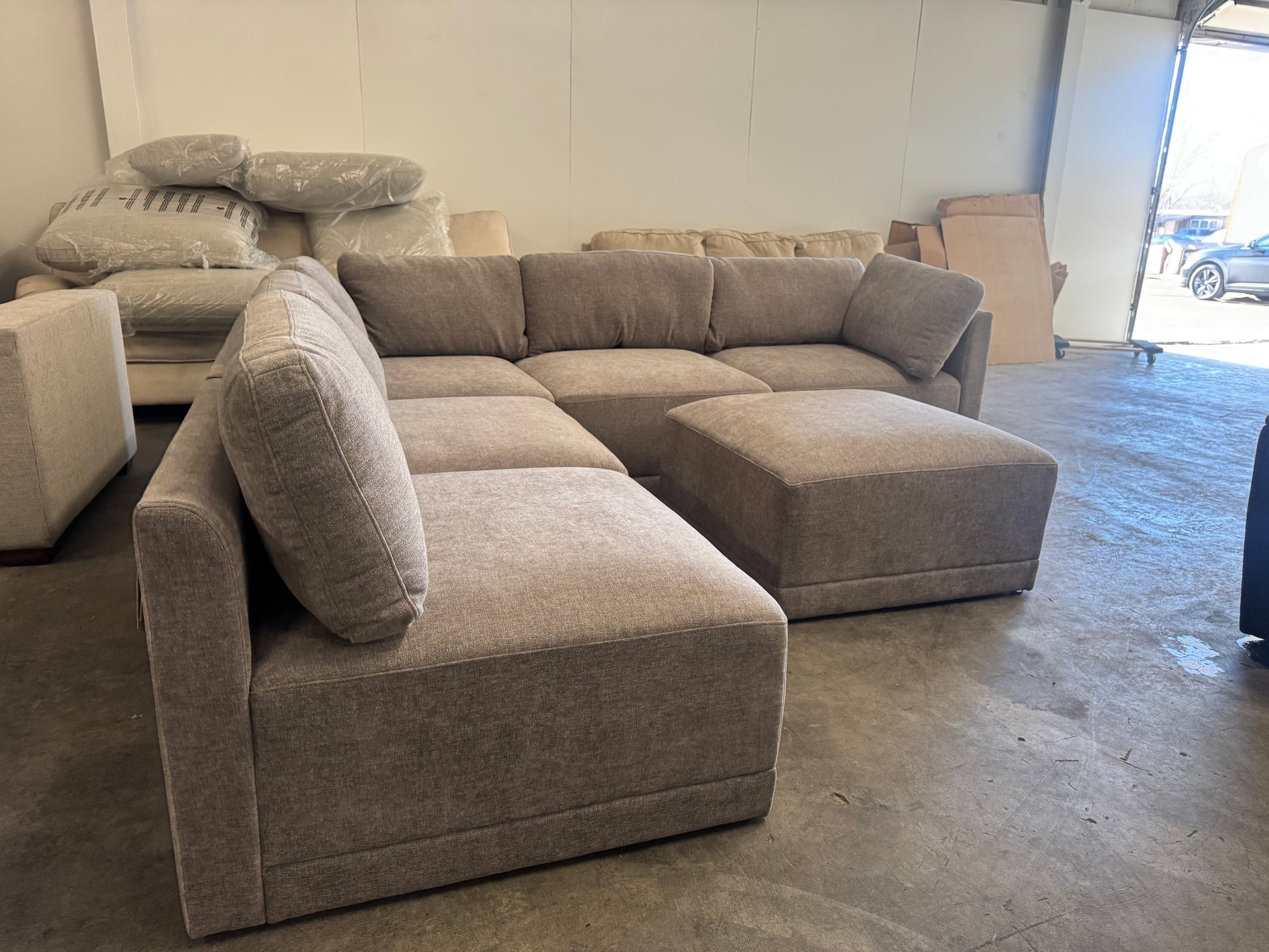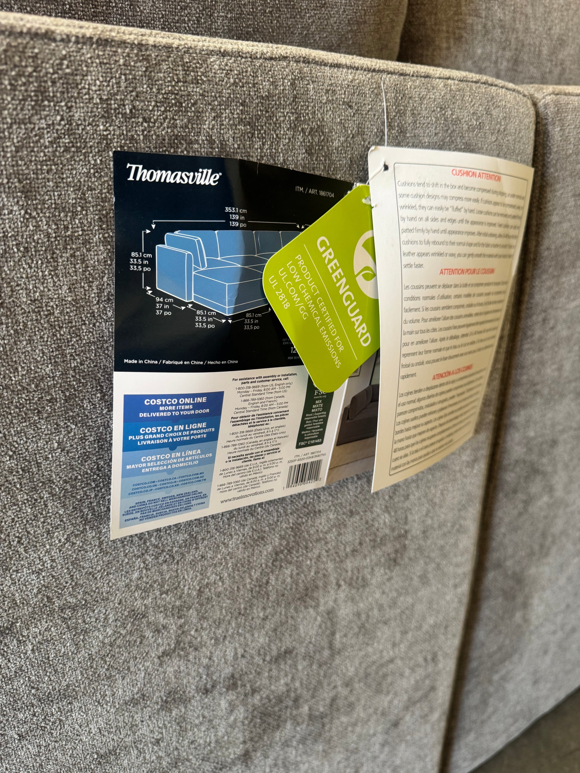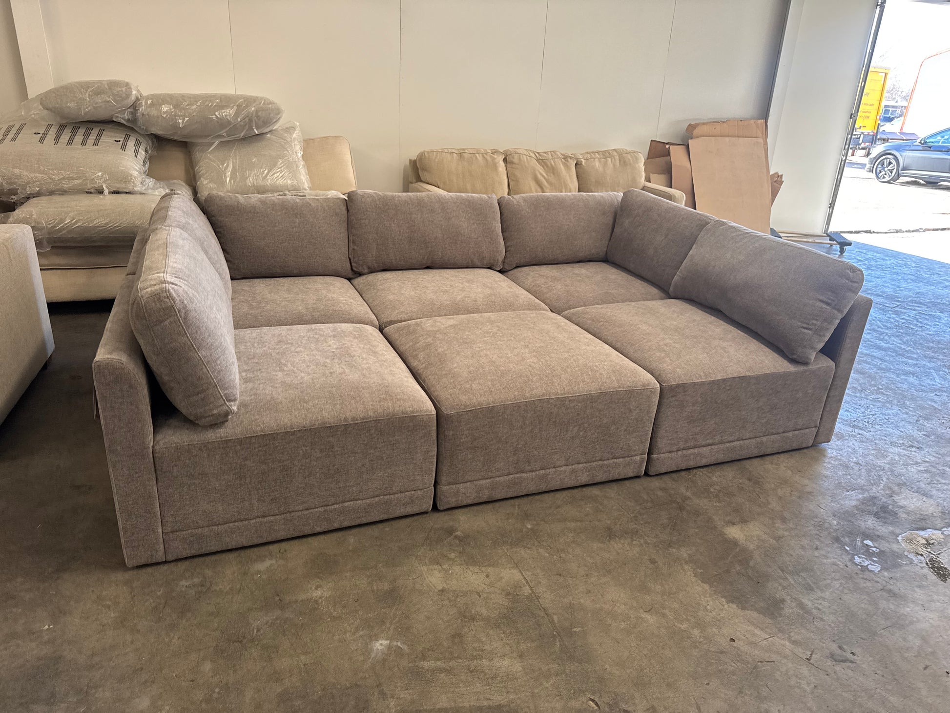 This is the Thomasville Fallon 6-Piece Modular Sectional with Ottoman, a premium Costco favorite known for its clean modern lines, deep seating, and flexible modular design. This set is brand new with original tags still attached and has never been used in a home. The neutral gray fabric works beautifully in modern, transitional, or minimalist spaces, and the modular layout allows you to reconfigure it to fit your room perfectly.