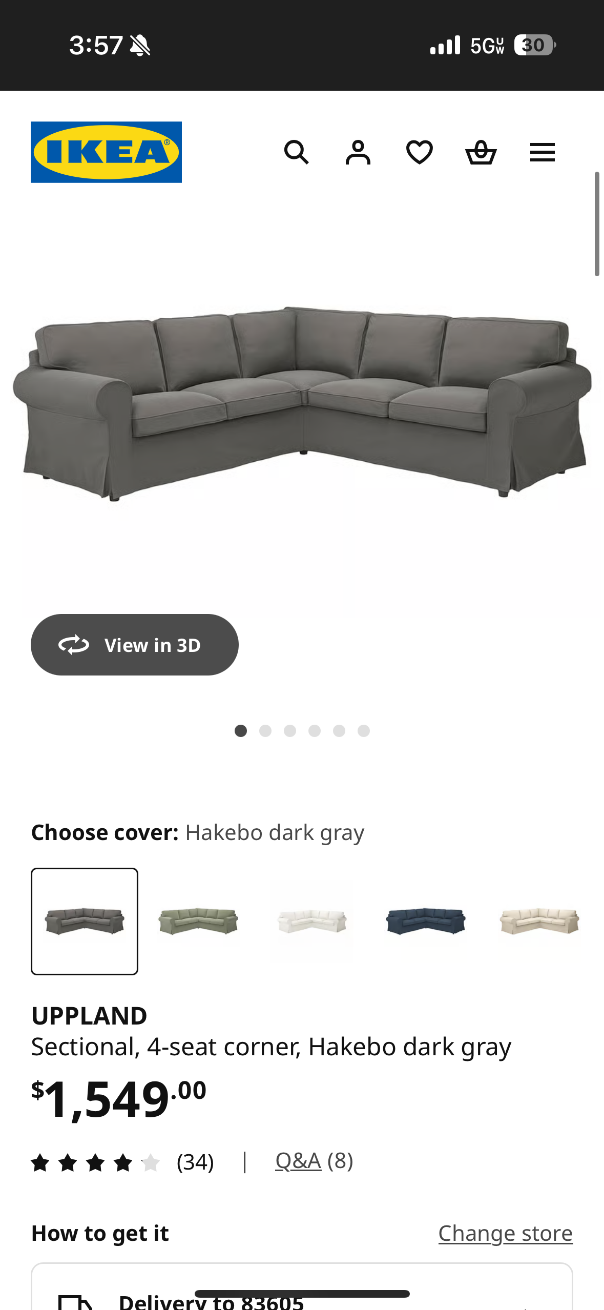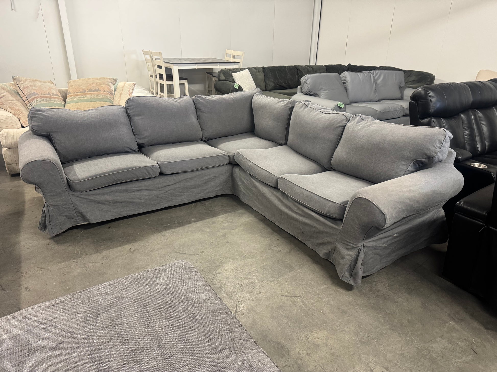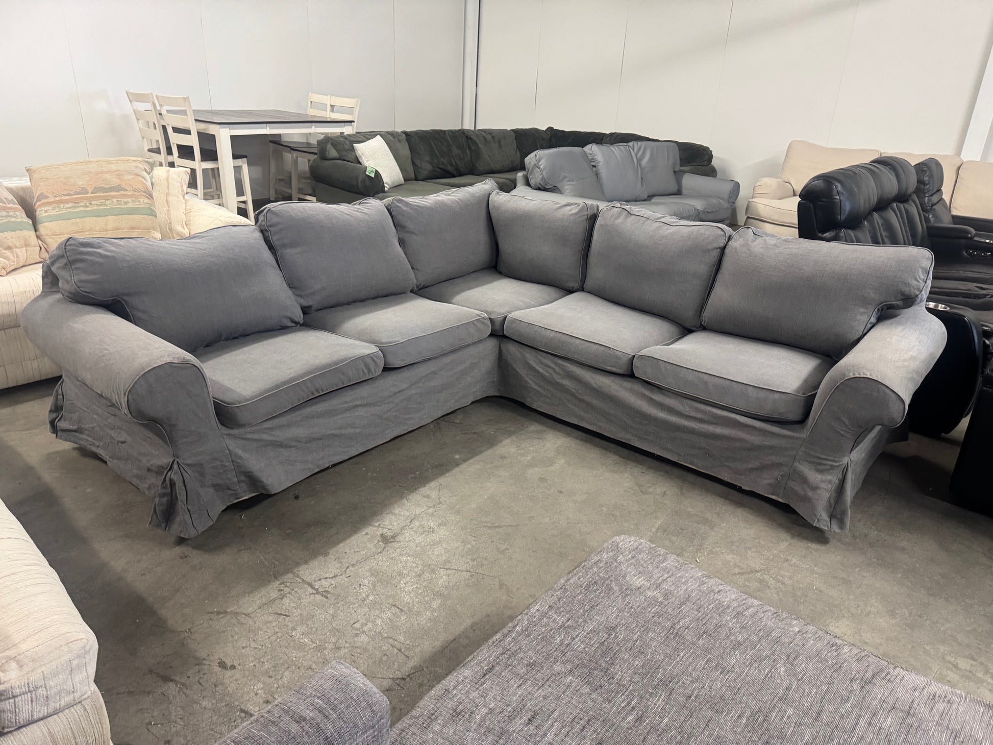 This gray IKEA L-shape sectional is a super practical and versatile option, especially if you want something easy to maintain. The fully removable and machine-washable slipcover and cushion covers make this a great choice for homes with kids, pets, or rentals. The clean Scandinavian design fits well in apartments or living rooms where you want comfort without bulk. Retailing new at $1,549, this is a solid deal at a fraction of the cost.