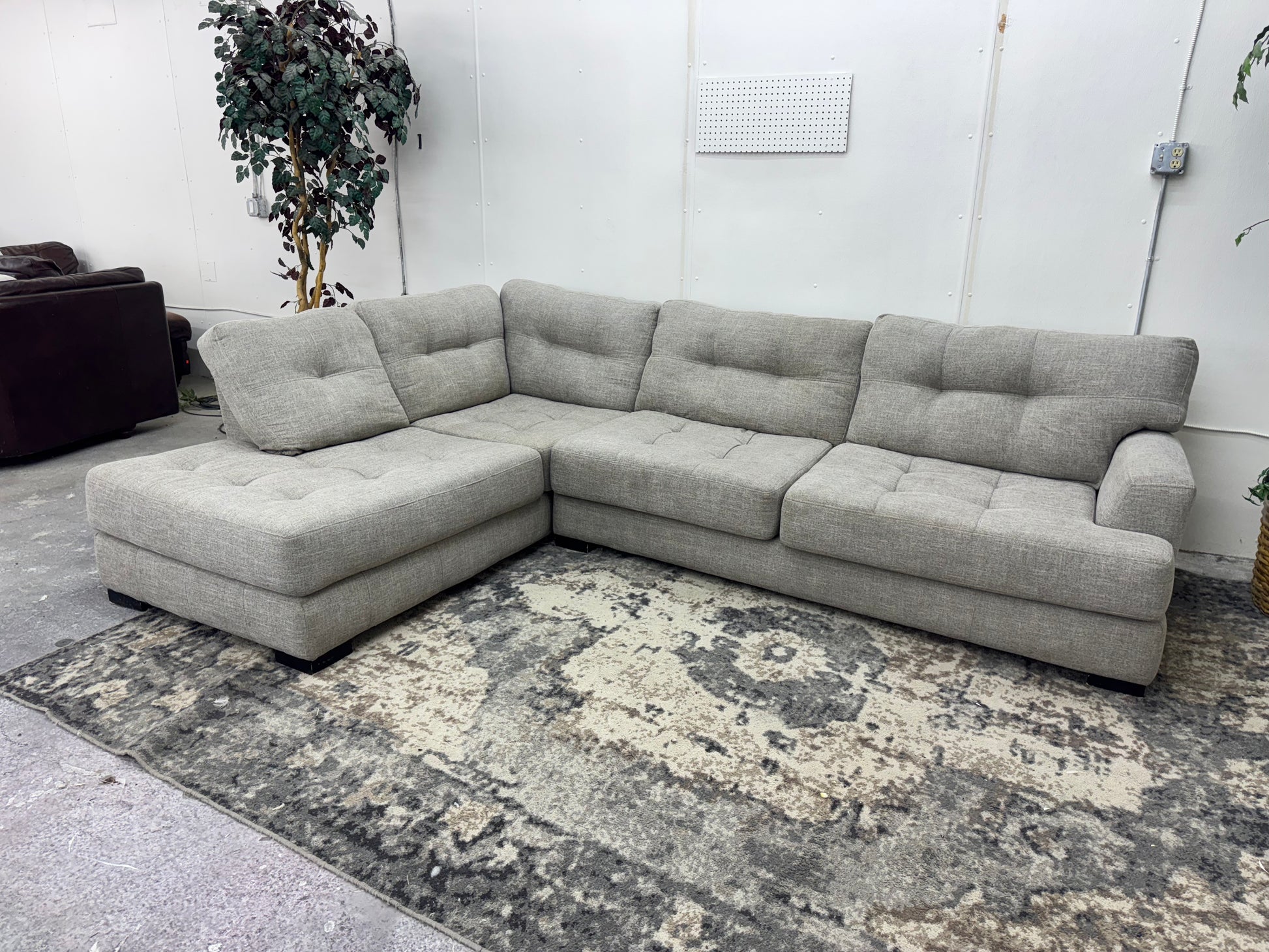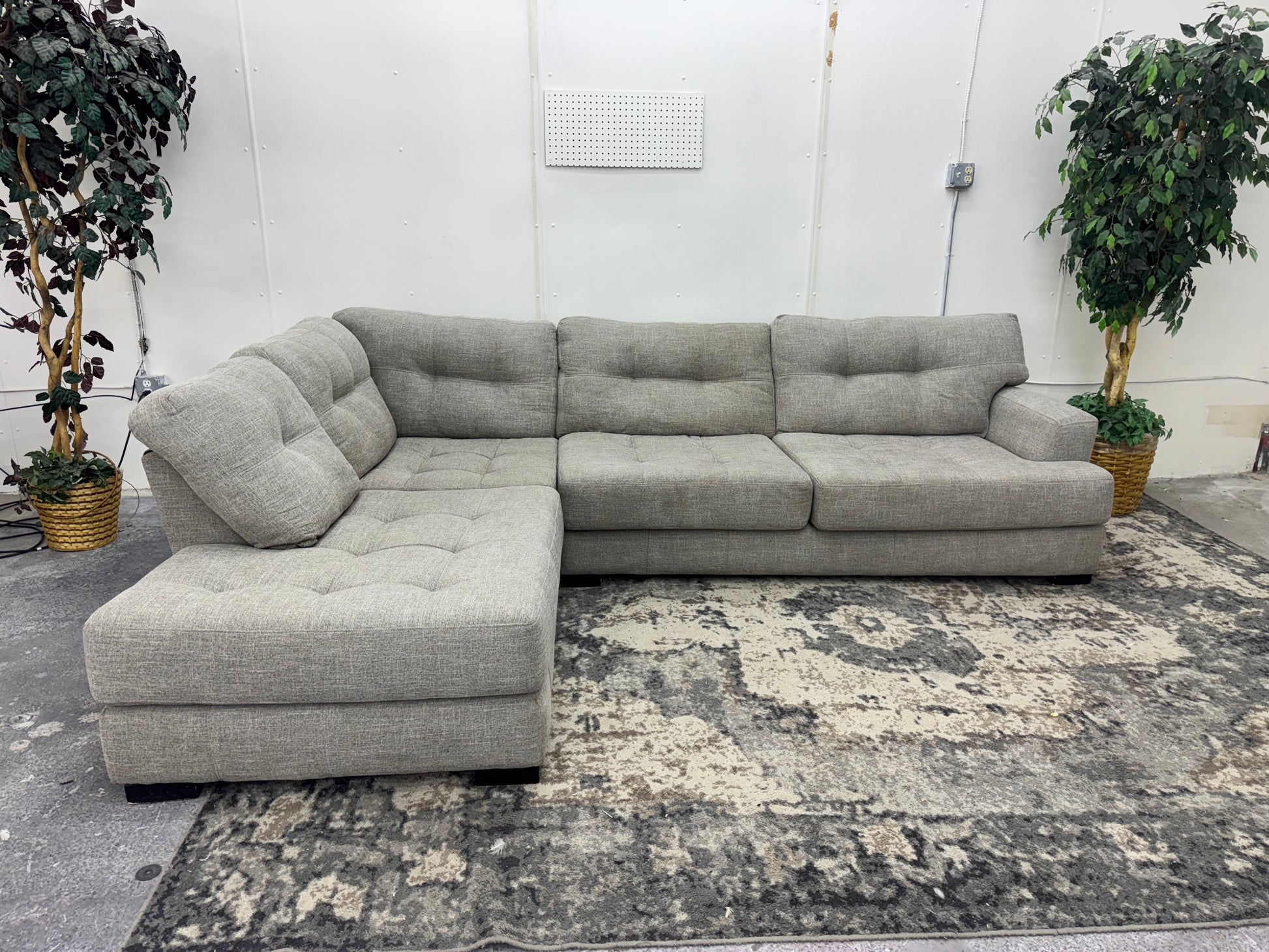This gray L-shape sectional delivers classic comfort and style with the added bonus of American craftsmanship. Featuring deep, supportive cushions and a modern tufted back design, it’s built to last while keeping your living space looking timeless.