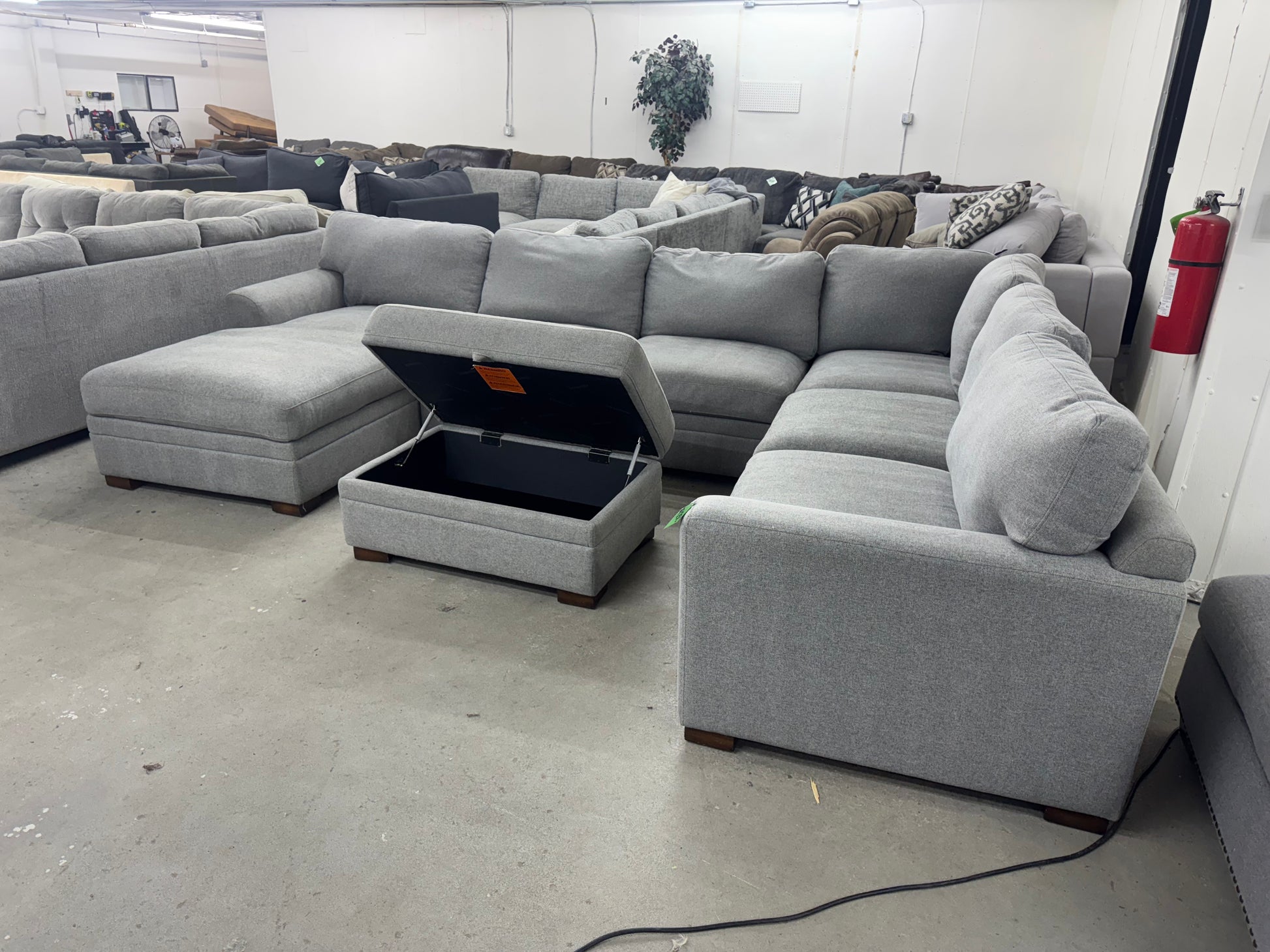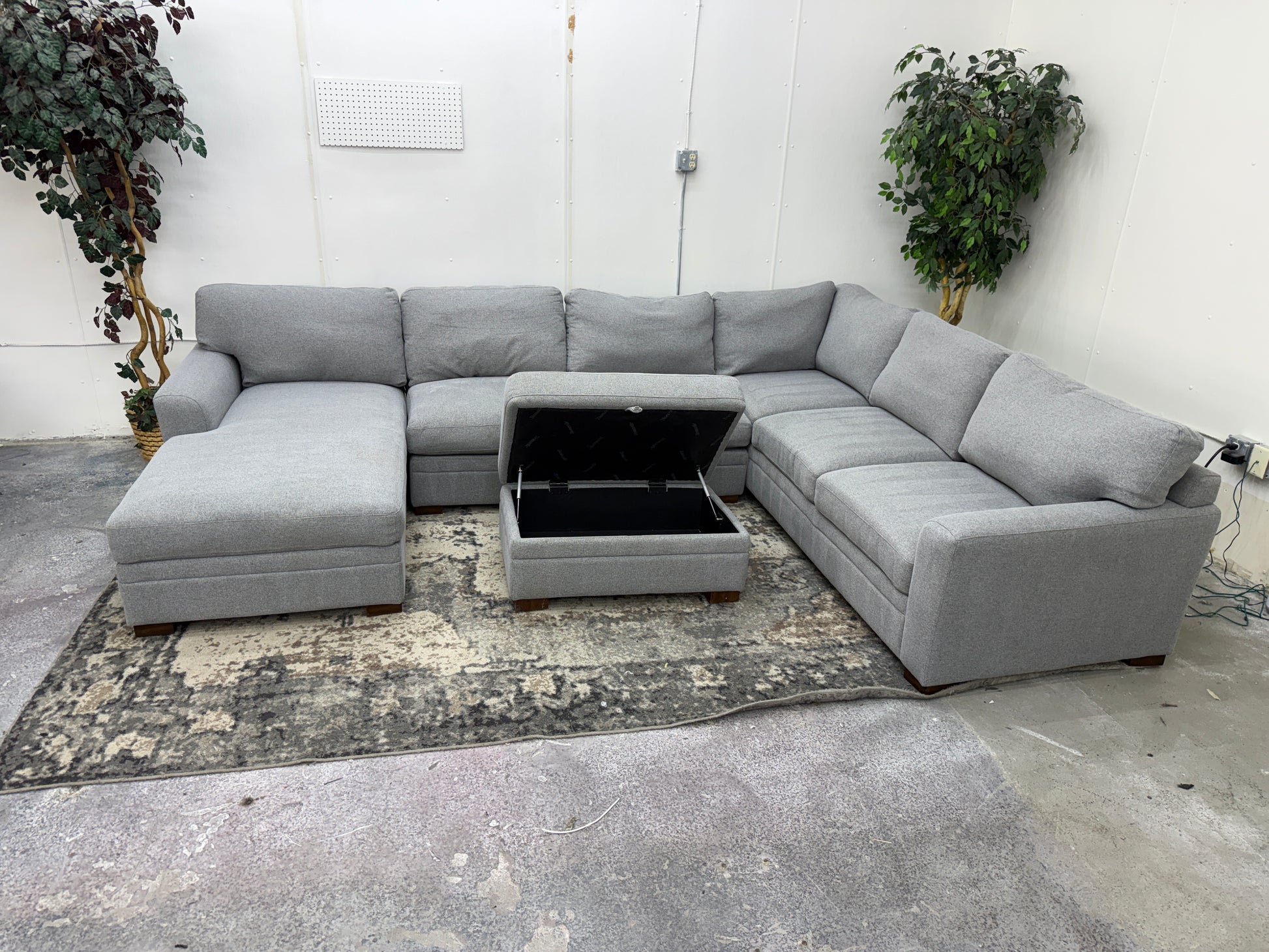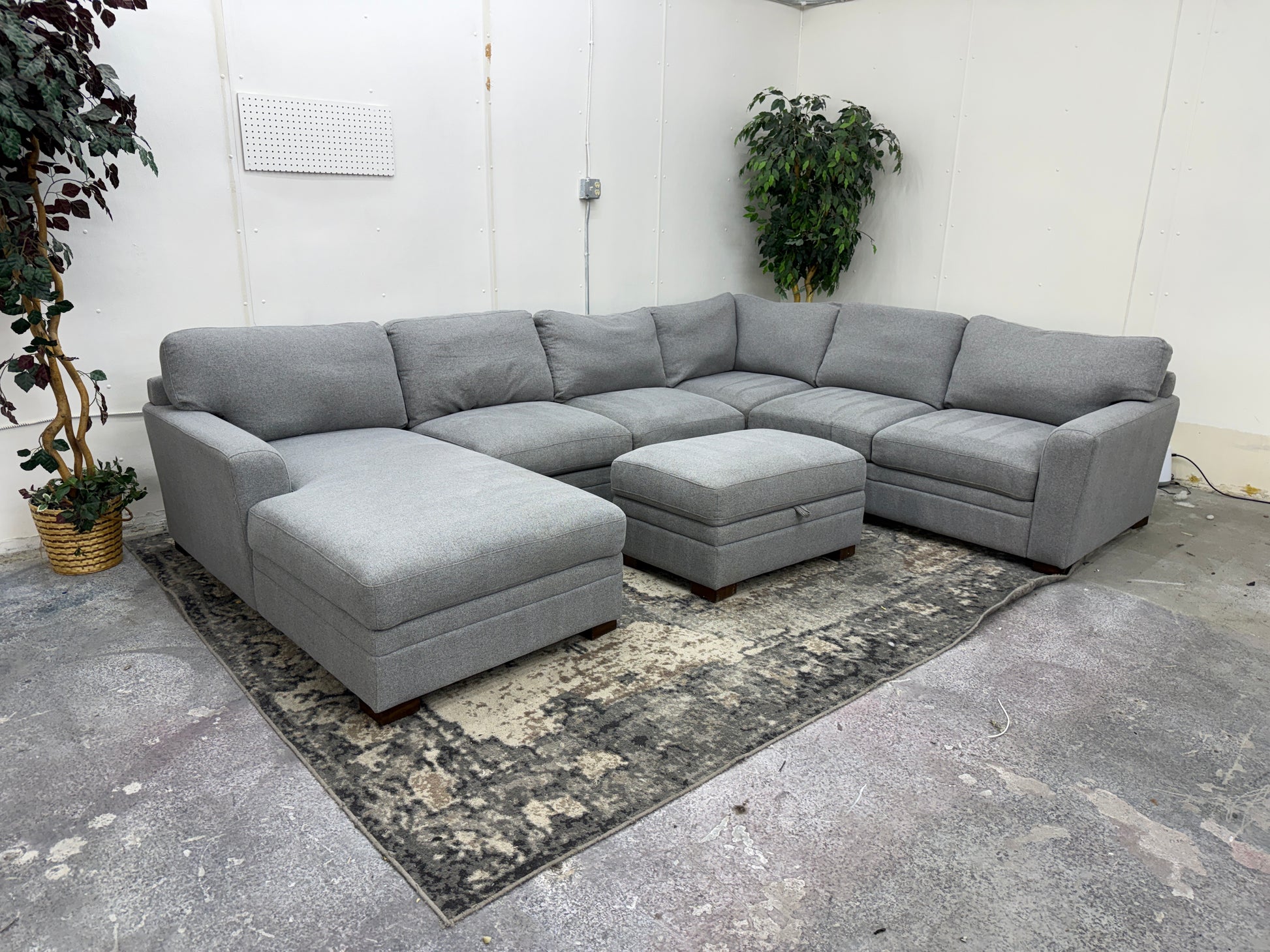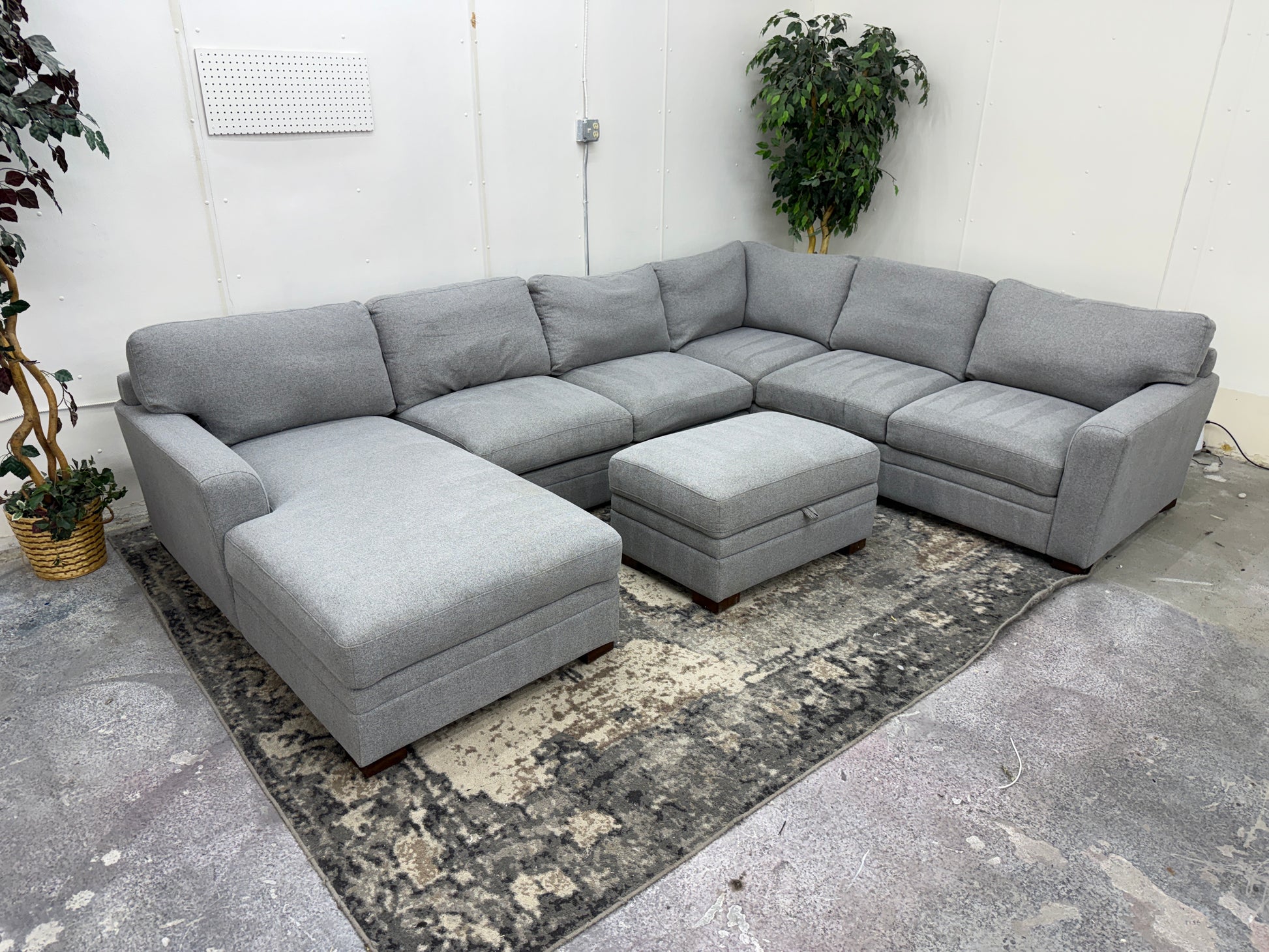 This gray U-shaped sofa with storage ottoman brings together space, style, and smart functionality in one beautiful package. With ample seating, deep cushions, and a matching storage ottoman to hide away blankets, pillows, or clutter, this piece is made for both entertaining and relaxing.