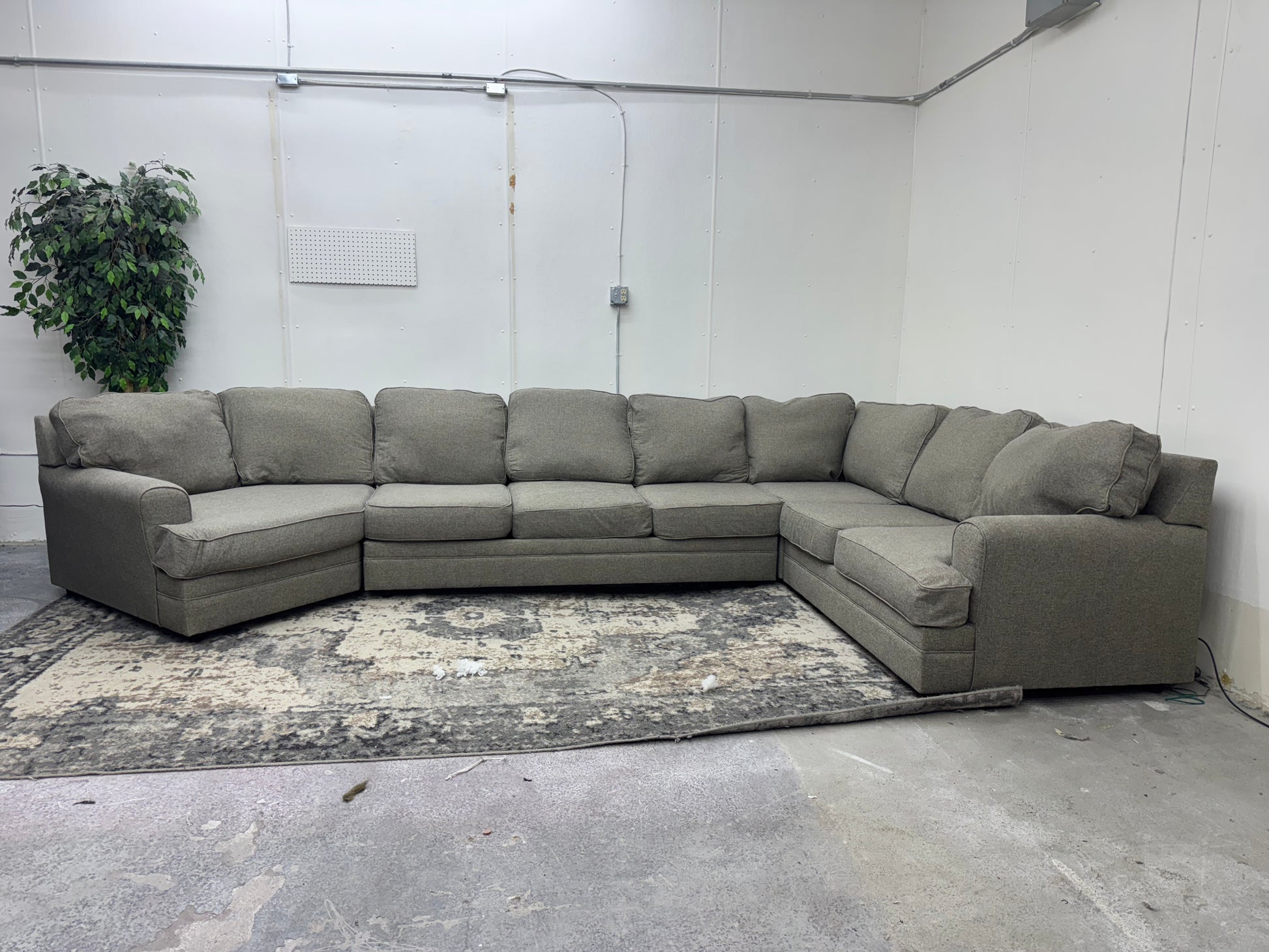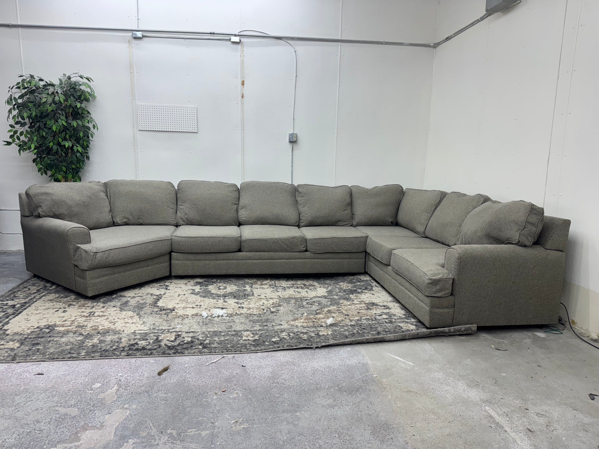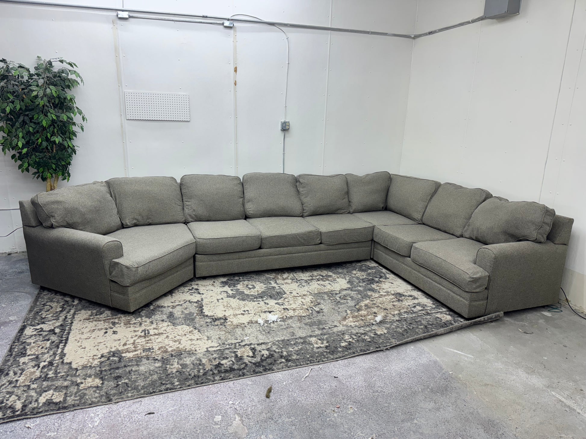 This huge gray sectional with a spacious cuddler chaise offers incredible comfort and seating capacity. Designed in four modular pieces, it can be rearranged for easy moving and flexible setup. Perfect for families, large living rooms, or anyone wanting a centerpiece sectional.