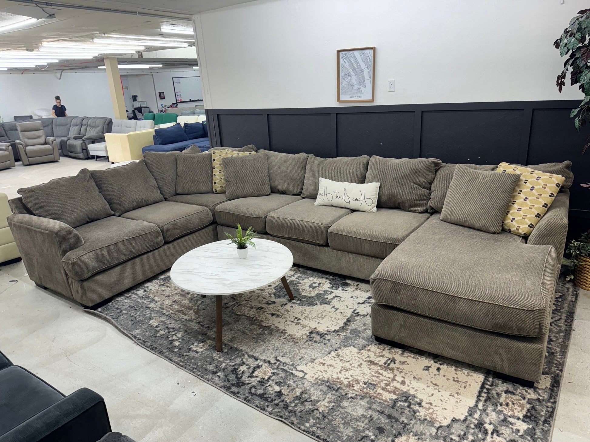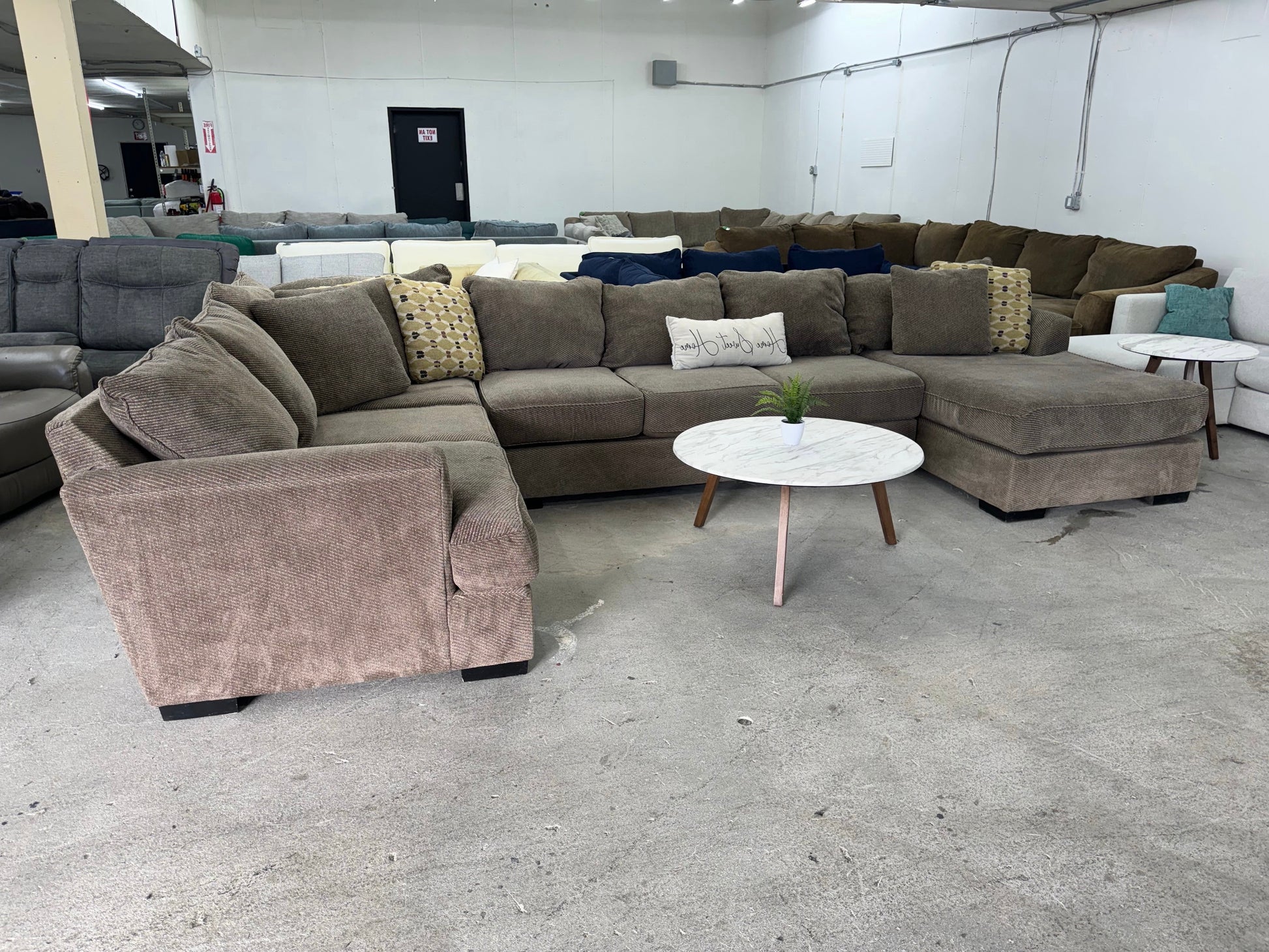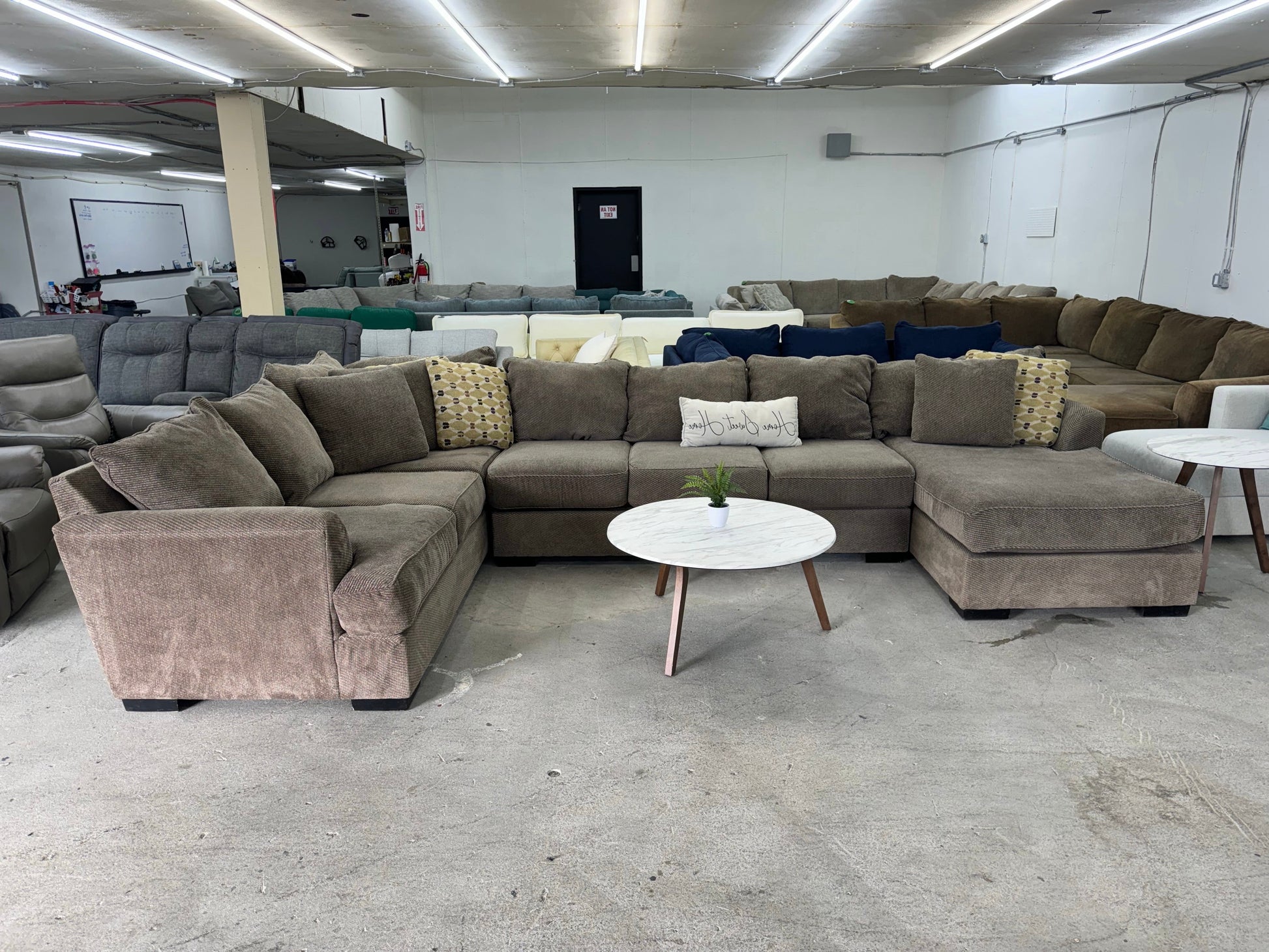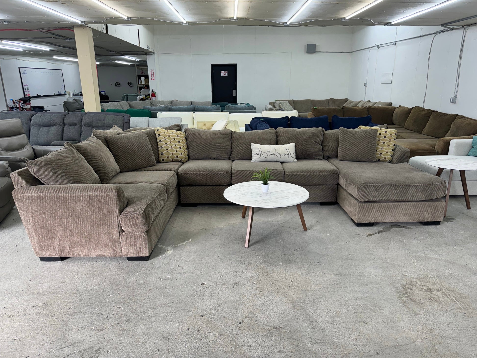 Stretch out in style with this huge plush brown U-shape sectional couch – perfect for big families, hosting friends, or just claiming all the comfy space for yourself. Soft, supportive cushions and a warm neutral tone make this piece a standout in any living room.