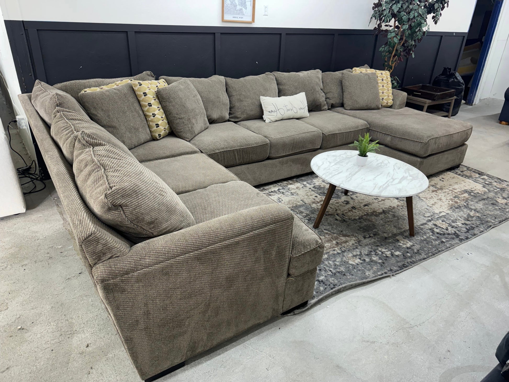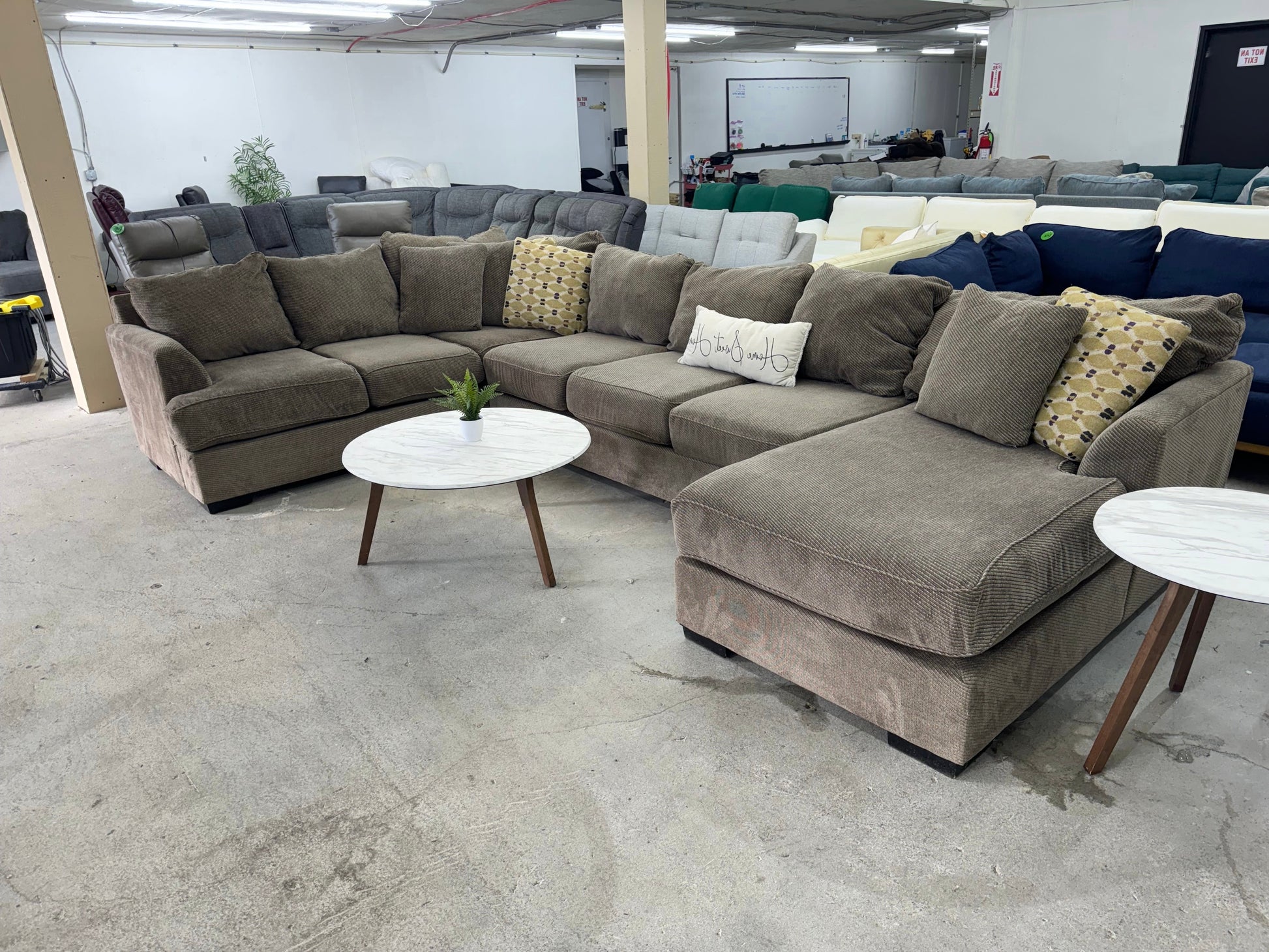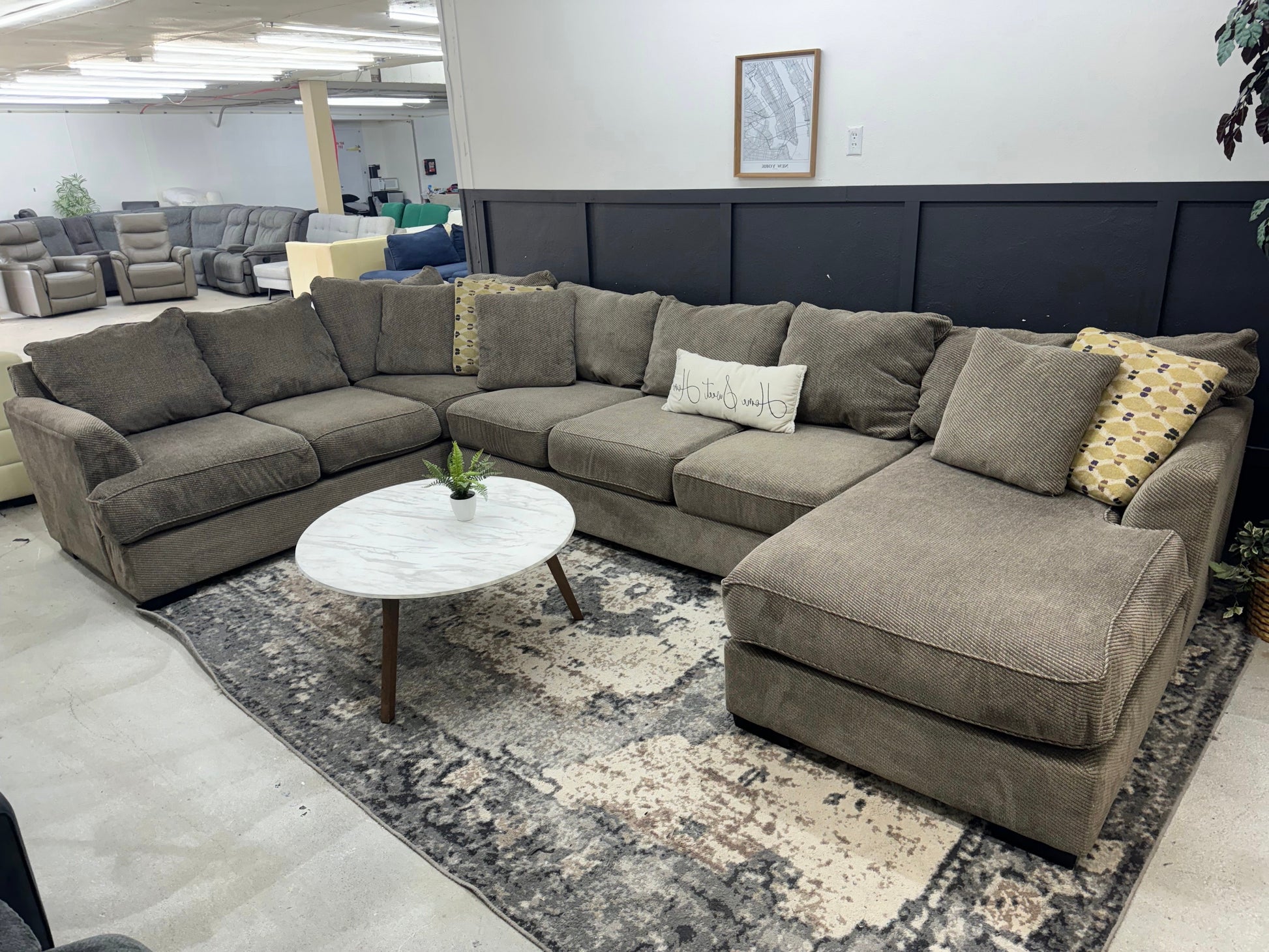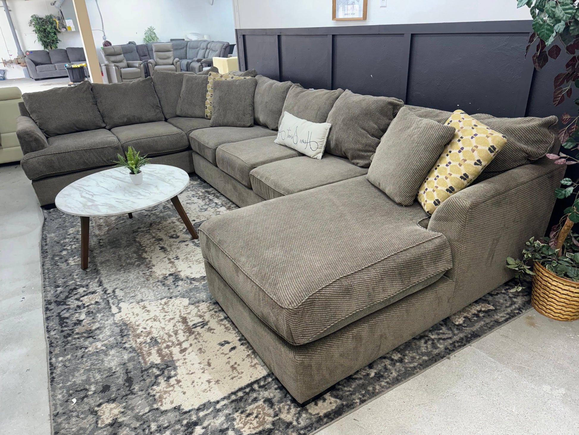 Stretch out in style with this huge plush brown U-shape sectional couch – perfect for big families, hosting friends, or just claiming all the comfy space for yourself. Soft, supportive cushions and a warm neutral tone make this piece a standout in any living room.