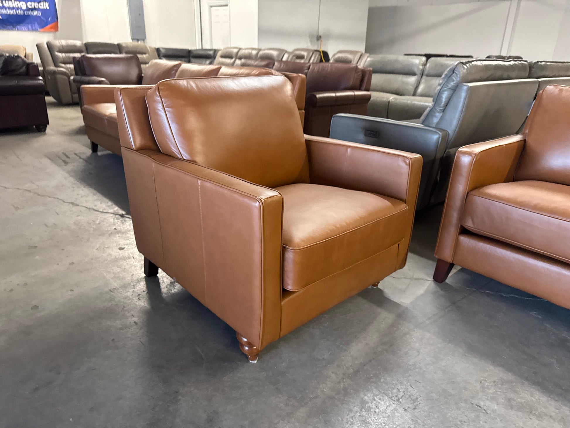 Camel brown, clean lines, modern track arms, solid wood legs, and rich brown leather give this set a high-end designer look that fits beautifully in modern, transitional, or mid-century inspired spaces.
