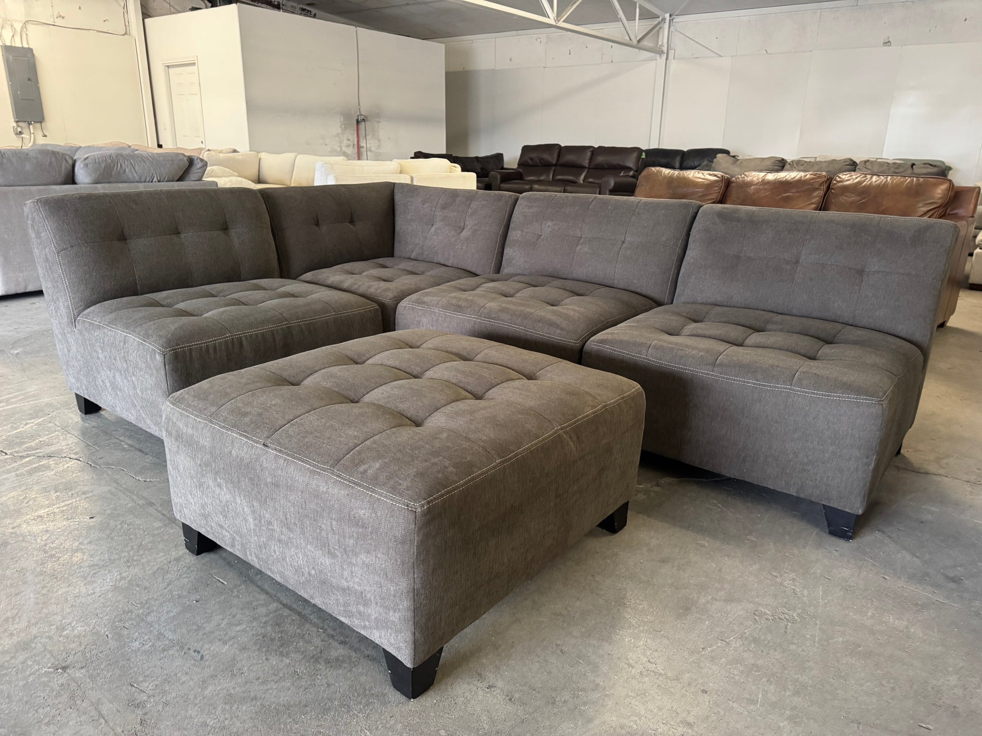 This like-new gray 5-piece modular sectional offers ultimate flexibility and comfort at an amazing value. Each piece can be rearranged to fit your space — create an L-shape, straight layout, lounge configuration, or anything in between. The matching ottoman adds even more options: extend the chaise, create a cozy pit setup, or use it as a footrest or coffee table alternative.