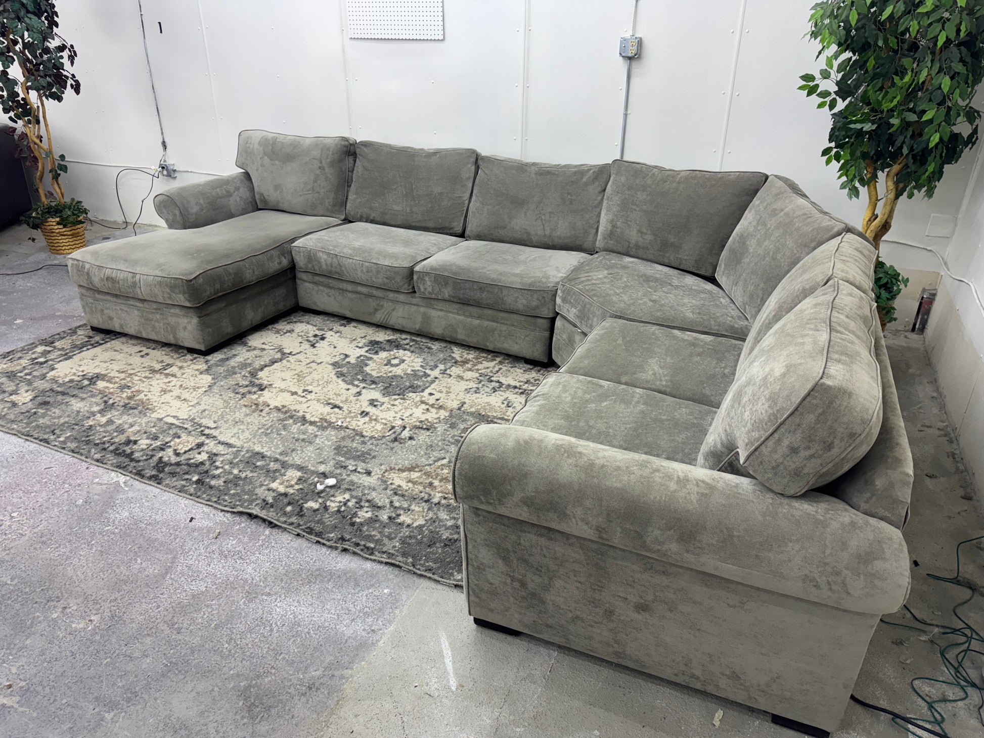 This LIKE NEW huge gray U-shaped sectional offers a perfect balance of comfort, flexibility, and size. With deep, plush cushions and a modern neutral design, it fits beautifully in any living room, basement, or loft. The best part? It comes apart into four smaller, easy-to-move pieces, making it effortless to fit through doorways or staircases.