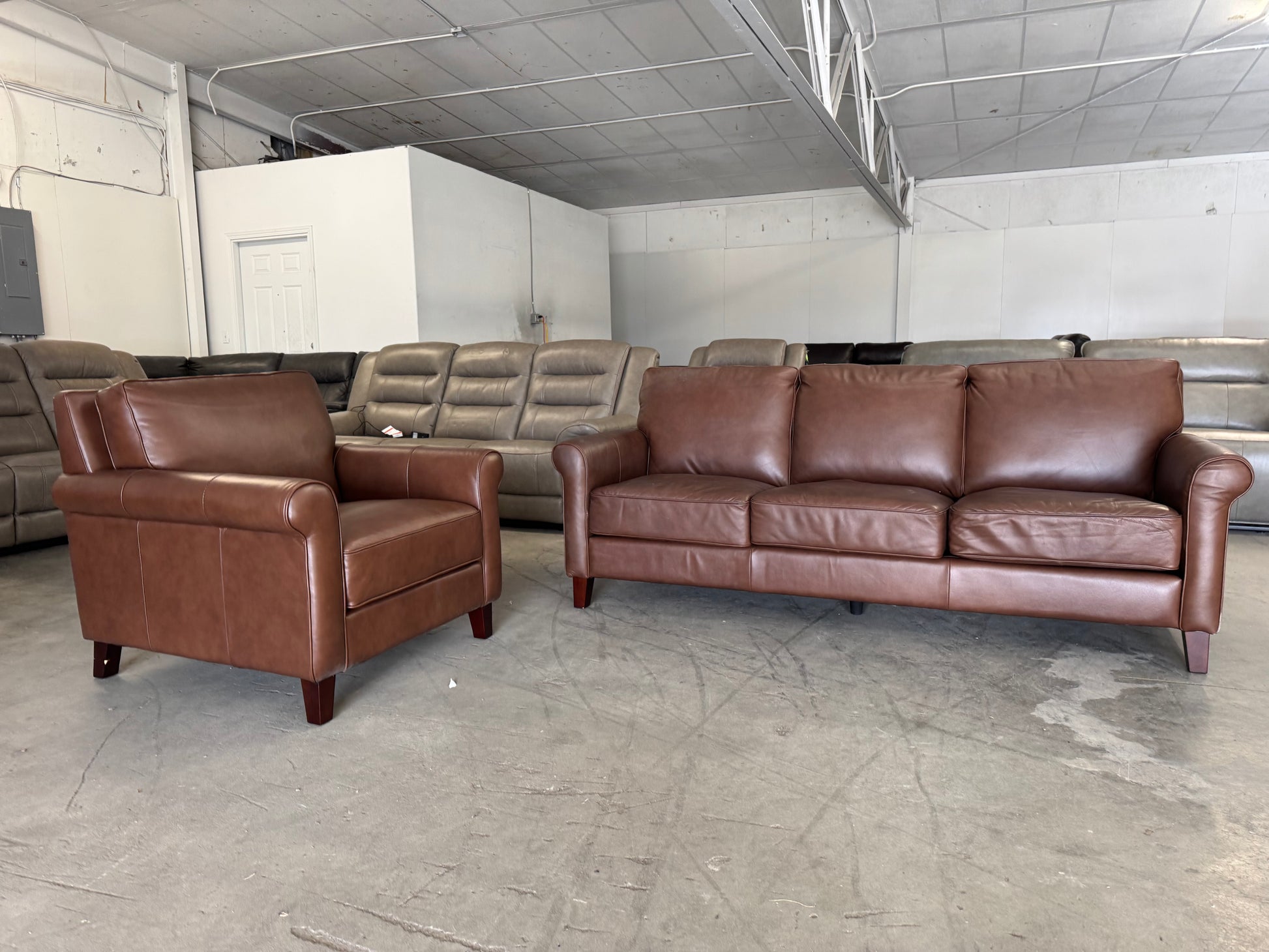 This Like New Larsen 2-Piece Top Grain Leather Set includes a full-size sofa and matching chair, offering timeless style and premium comfort at a massive discount.