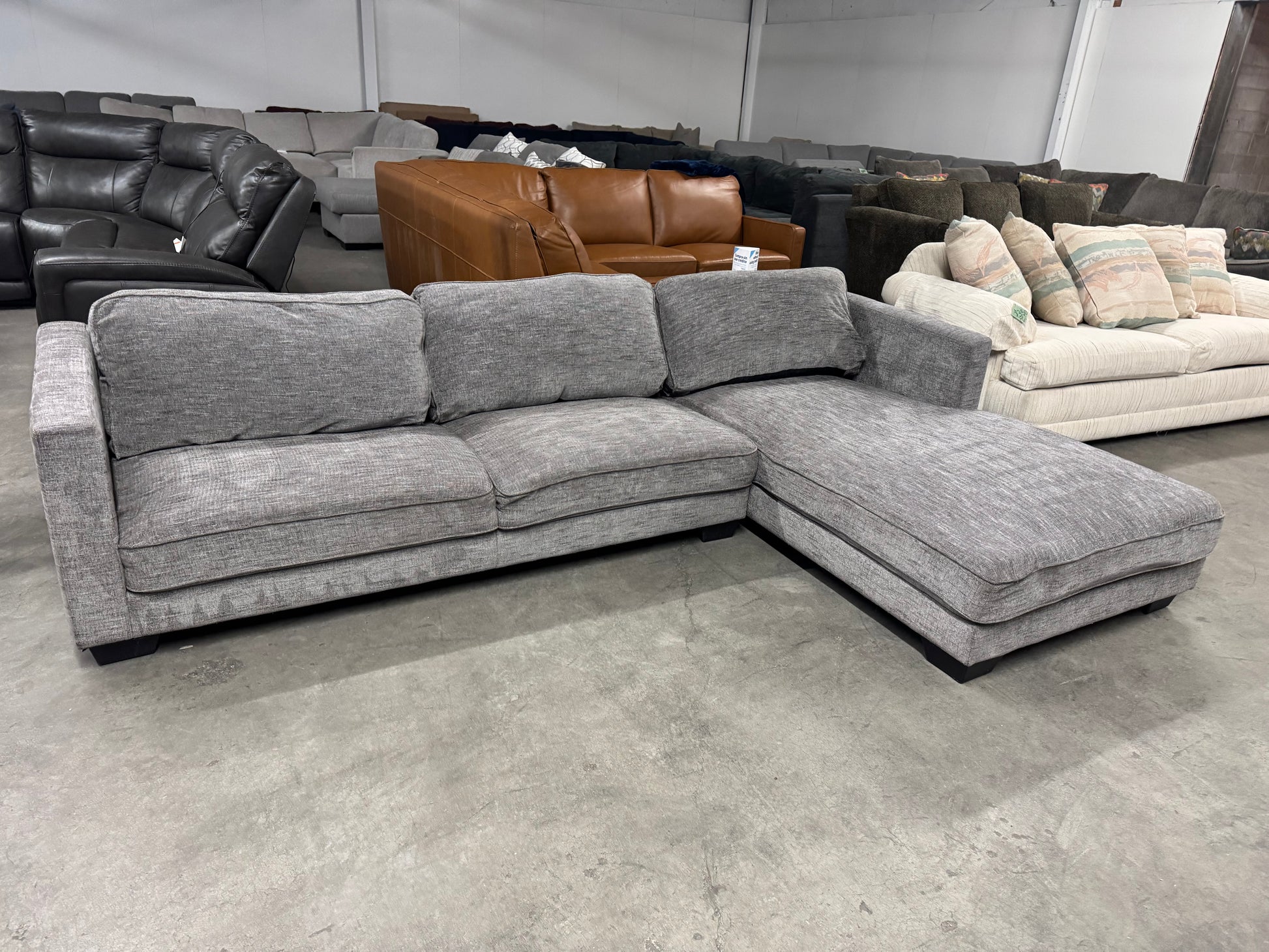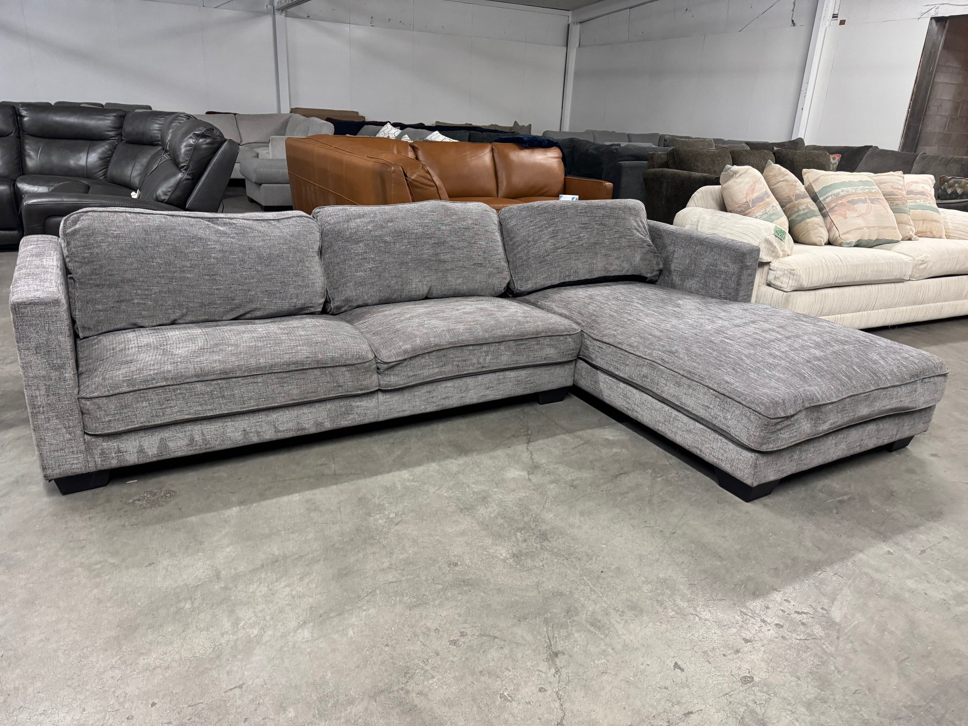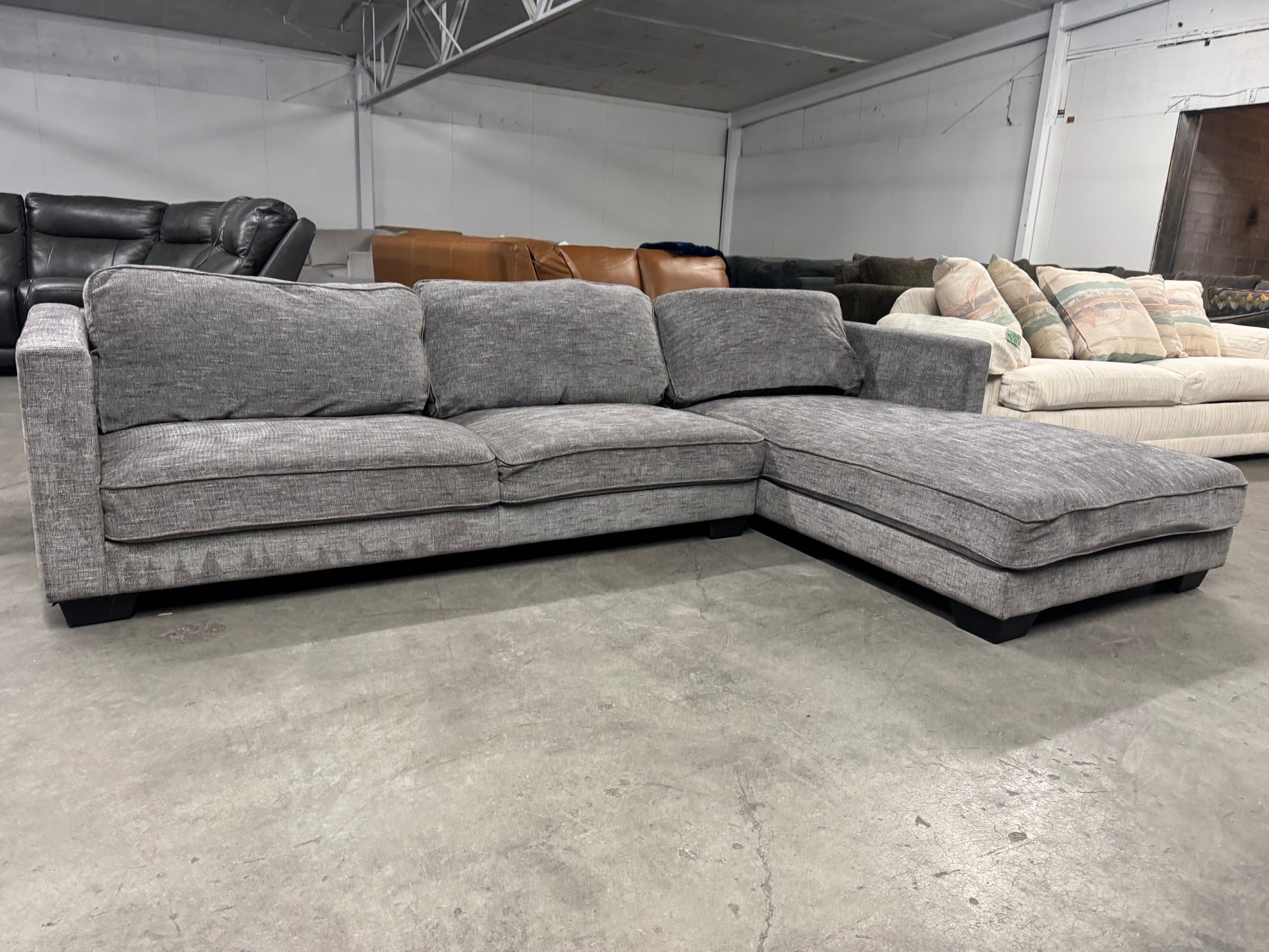 This low-profile gray L-shaped sectional is a clean, modern option that works perfectly in apartments, townhomes, or minimalist living spaces. The streamlined silhouette keeps the room feeling open, while the chaise offers a comfortable place to stretch out without overwhelming the space.