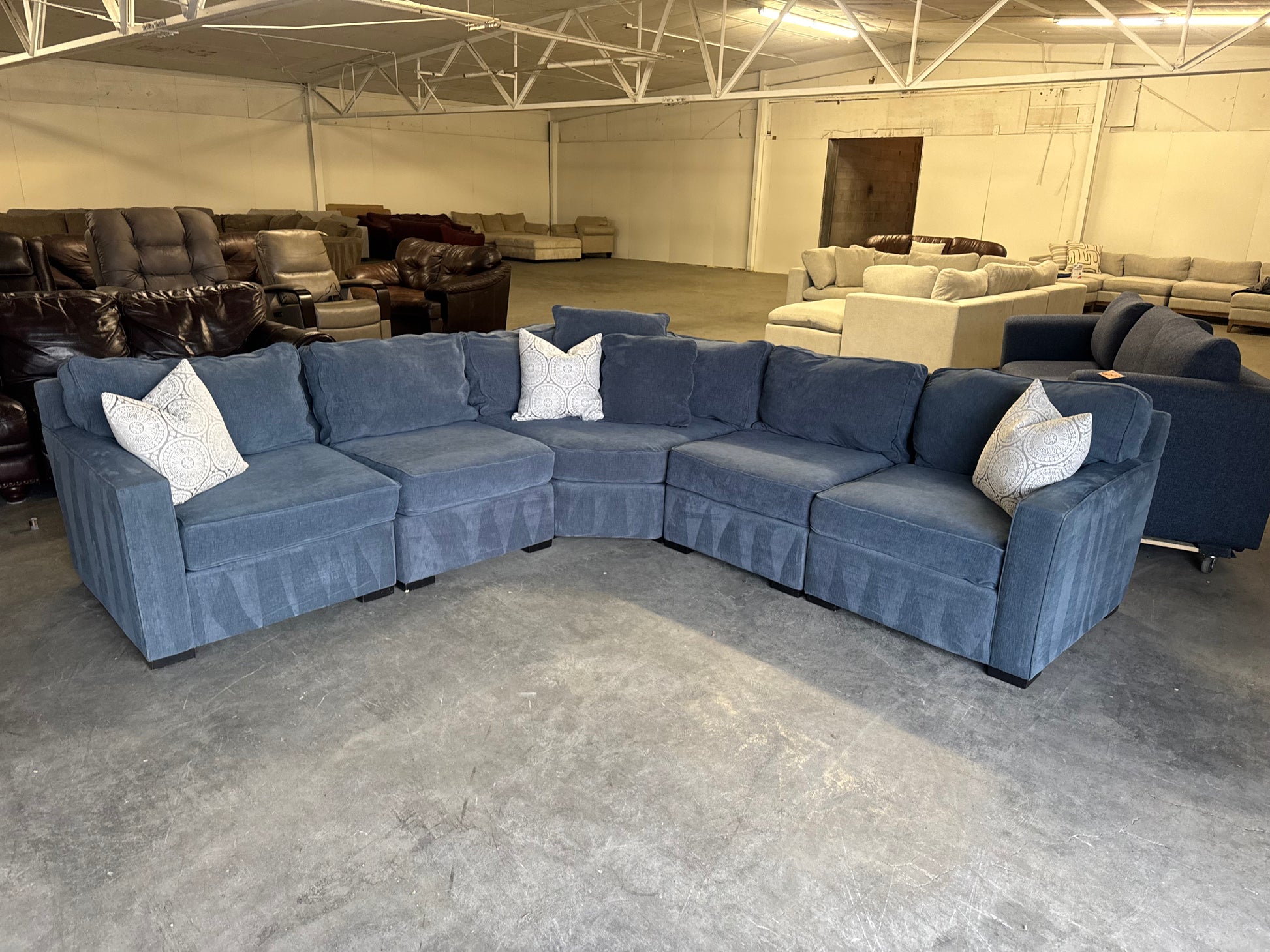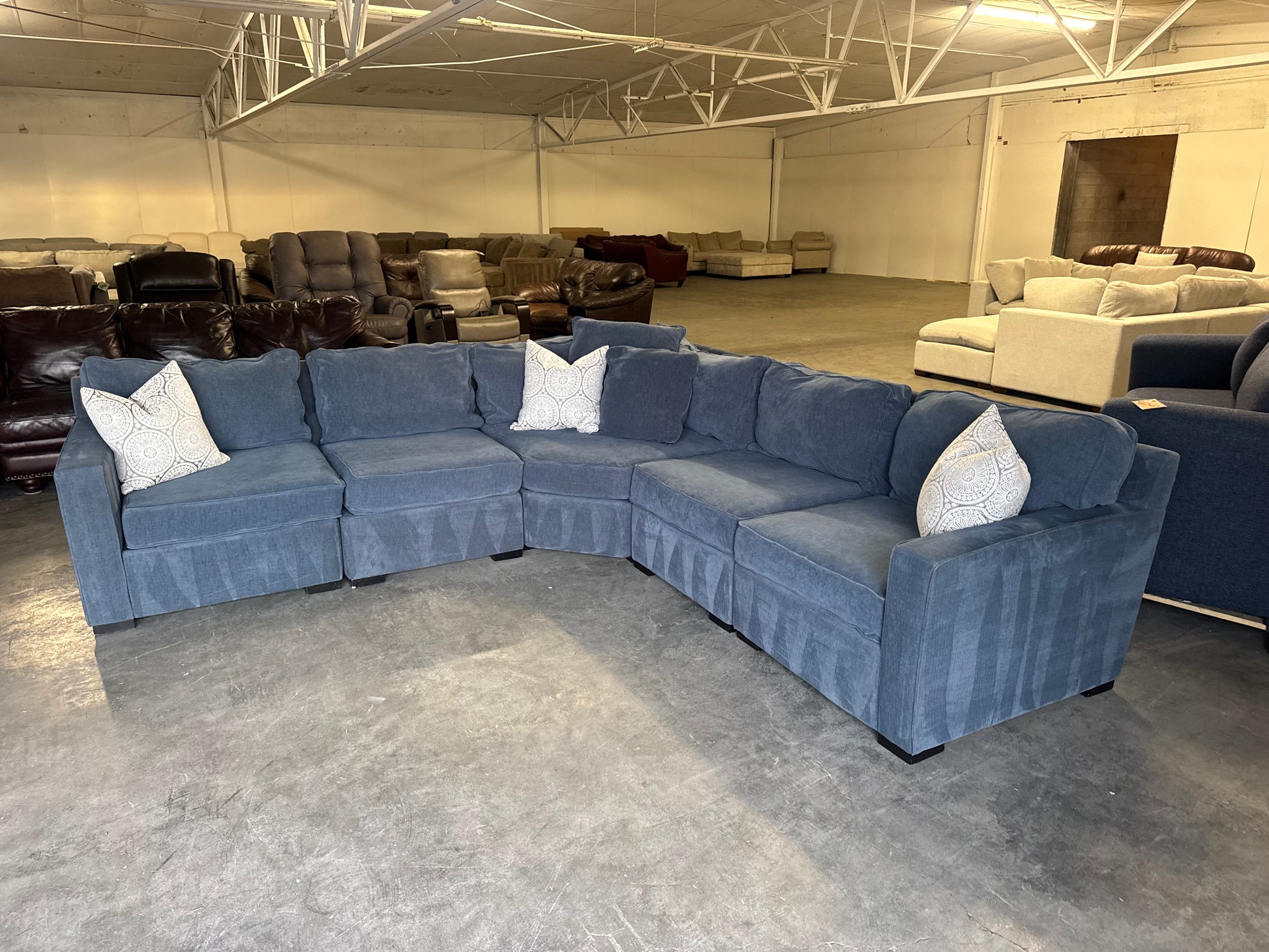 This is a Radley Fabric 5-Piece Sectional Sofa from Macy’s, finished in the highly sought-after Heavenly Naval Blue. Clean-lined, modern, and incredibly comfortable, this sectional is a staple in higher-end homes and apartments. Built in the USA, the Radley line is known for its durability, deep seating, and timeless design.