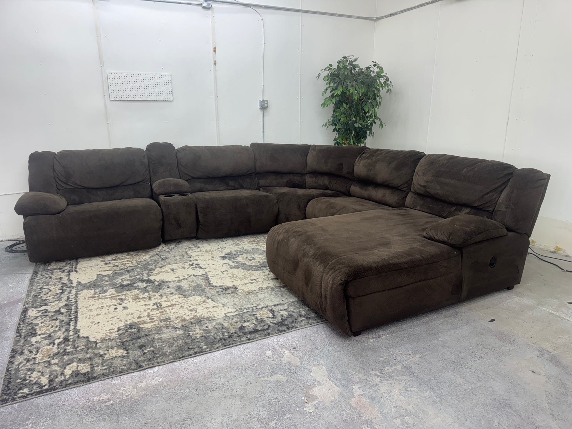 This plush brown 6-piece modular sectional combines maximum comfort with versatile design. With 2 built-in recliners and a reclining chaise, it’s perfect for lounging, movie nights, or entertaining. Its modular layout allows you to rearrange the pieces to fit your space.