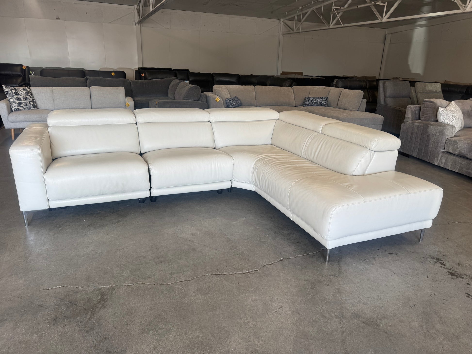 This gorgeous white leather sectional is a true statement piece that blends modern style with everyday comfort. Upholstered in smooth, high-quality leather, this sectional features dual power recliners and a spacious chaise lounge, making it perfect for relaxing, entertaining, or stretching out after a long day. The clean white finish and sleek metal legs give it a contemporary, upscale look you’d expect at a much higher retail price.